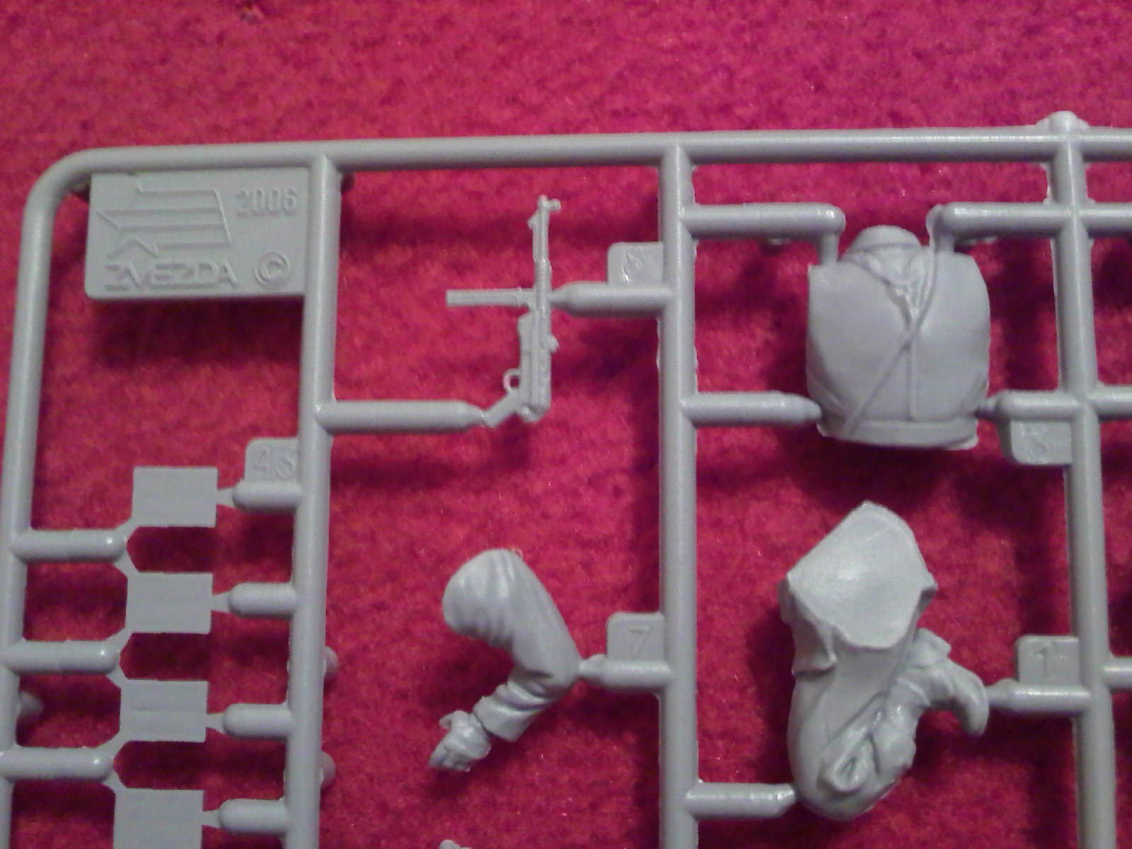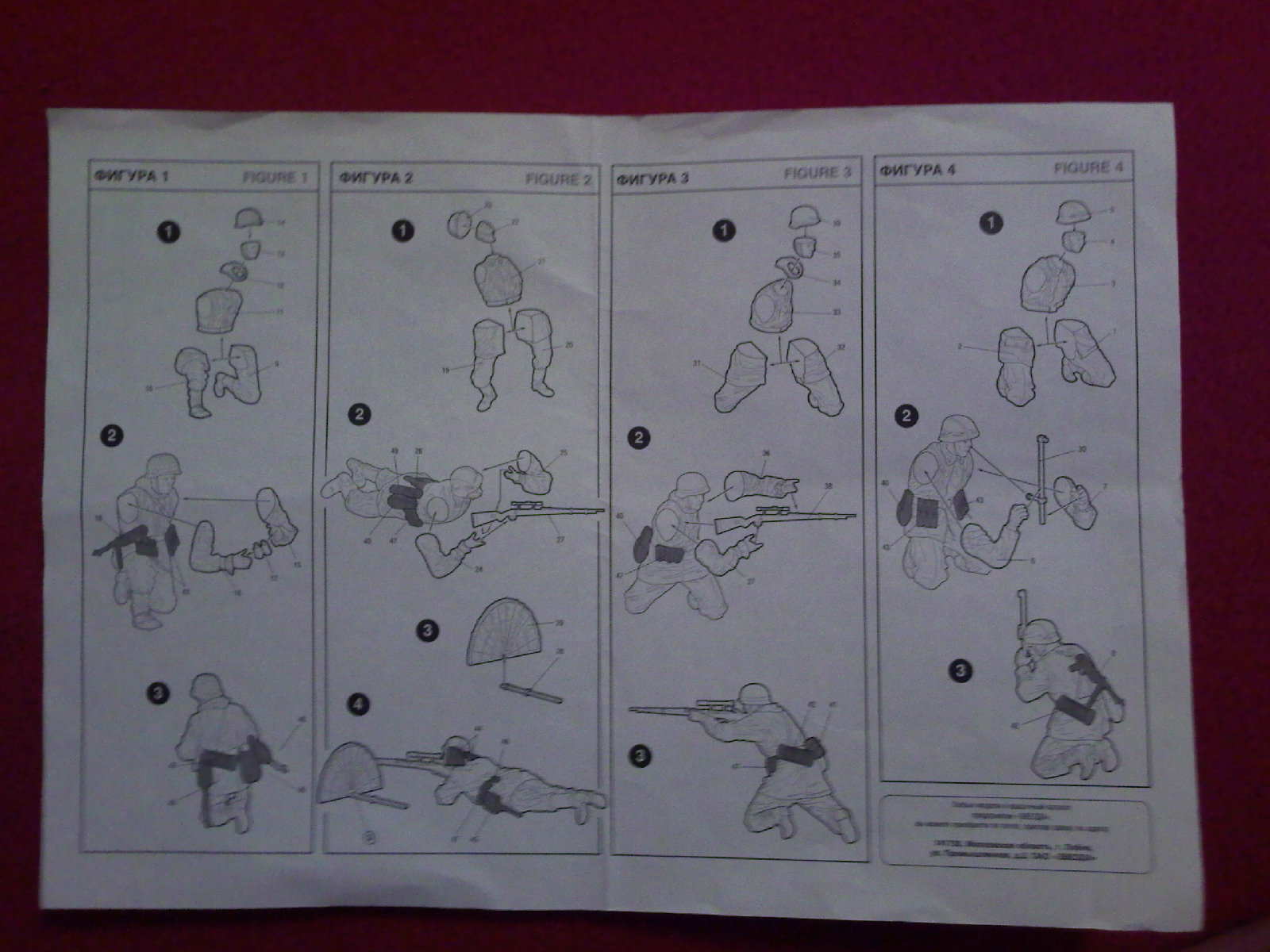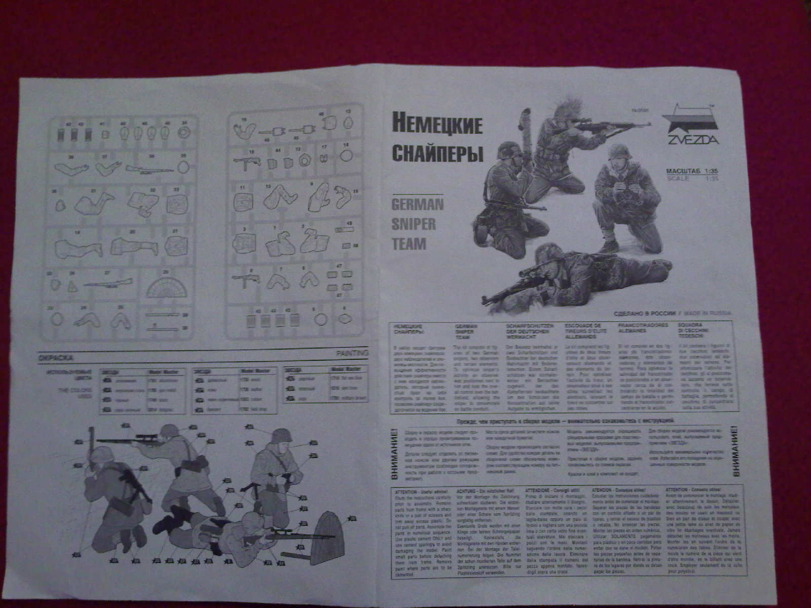 Два немецких снайпера и два наблюдателя лежат в коробке из мягкого картона. На двух литниках отлит 2006 год, а это значит что фигурки лепил скульптор. По этому идёт некоторая замыленность и схожесть лиц. Однако порадовали фляги и "элементы местности". По этому этот набор скорее для отработки каких то моментов, нежели для любителей высокой детализации. Весьма интересный фильм "Обучающий фильм для немецких снайперов" времён Второй Мировой можно смотреть тут: