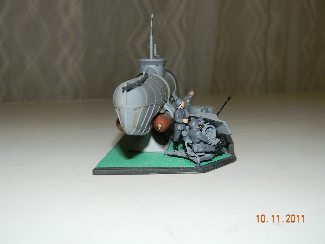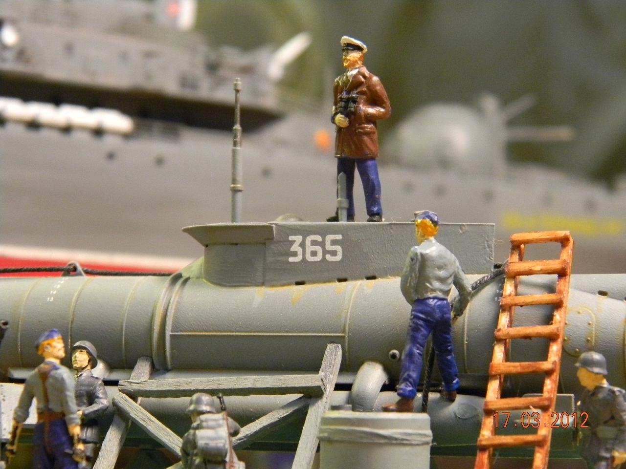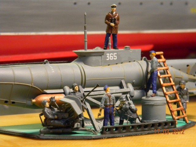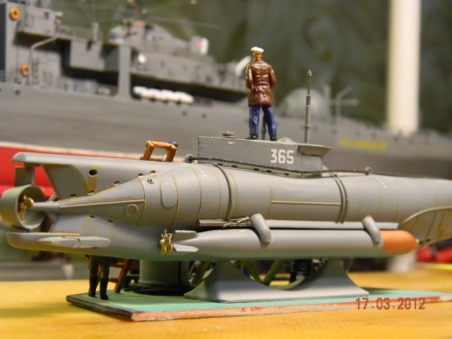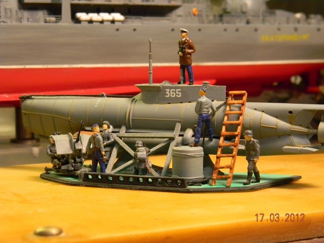 Здравствуйте господа моделисты ! Вот решился выставить своего " ТЮЛЕНЬЧИКА " Посамой подлодке многого не скажешь т.к. повоевать толком им не пришлось ( выпуск начался в конце войны ) и нам и союзникам в этом очень повезло ! Но шуму по поводу появления их у немцев было много, особенно англечане сильно обеспокоились своим прибрежным судоходством - потомучто эти подлодки практически не обнаружимы . По модели : стыковка и собираемость на высоком уровне ! Была собрана и окрашена за 2 вечера , красил ТАМИЕЙ . ржавчена-МИГ. Собрал ,поставил на полку -ну чет не то .Из куска пластика резанул подставку ,прикрепил фал, сделал бочку и понеслось.......... Зенитка и солдаты ЗВЕЗДА ; капитан и матросы РЕВЕЛ . Приятного всем просмотра ...