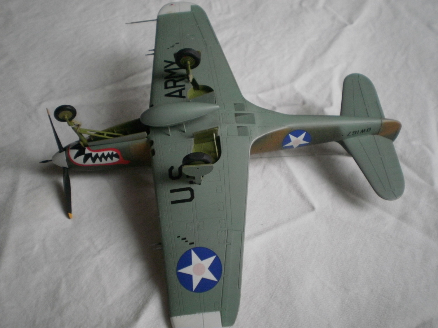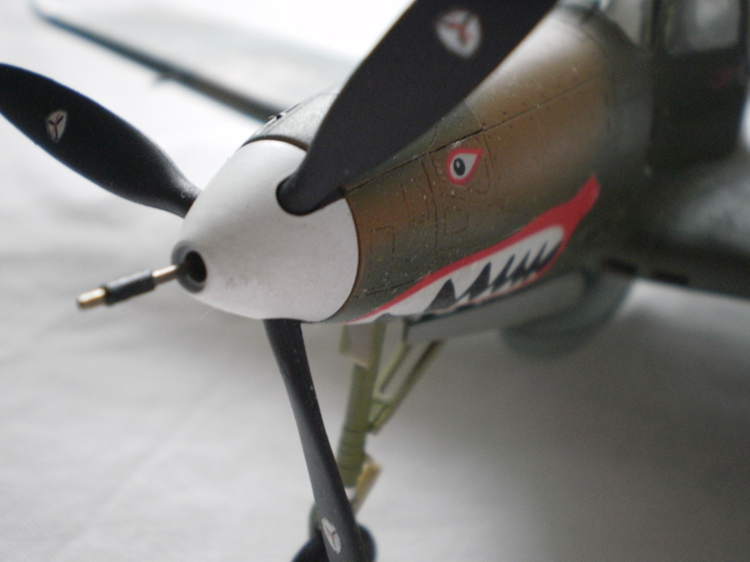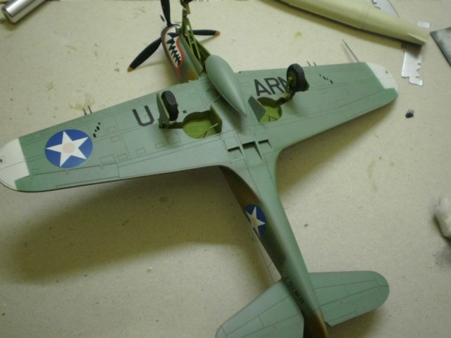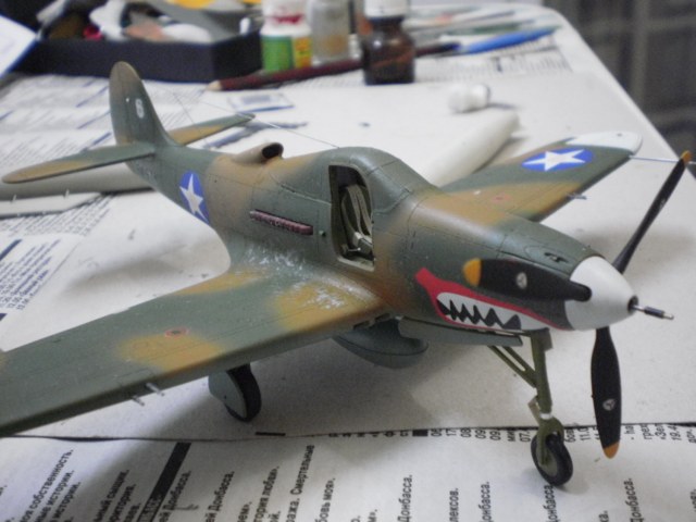 модель очень похожа по окраске на самолеты 67 ИЭ. Так как Вы не указываете принадлежность к конкретной воинской части, не могу сказать, что окраска неверна. В частности Р-400 67 ИЭ в 1942 г. действовали над морем и островами (Новая Гвинея, Новая Каледония, Гуадалканал). Поэтому имели "региональный" камуфляж: сине-коричневые полосы поверх английской схемы и белые законцовки крыльев-ЭБР. Оскаленная акулья пасть-"фирменная" эмблема эскадрильи, была нарисована на всех самолетах.