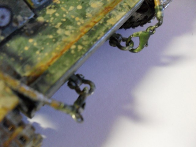Базовый цвет - olive green от Tamiya color, грязь - желто-серый акан, ржавчина - краски DECOLA. Эффект металла - серебряный аэрозоль и карандаш. Красил кистью. МТО - сетка с чайного пакетика. Тросы из шнура+заменены крепления от ювелирной цепочки.