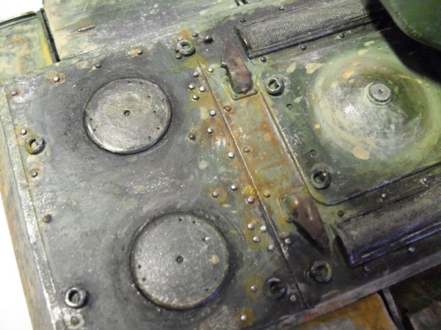 главный совет для вас как новичку один-не думайте, что чем больше вы заляпаете модель всякими какашками и сделайте ее "металлической", то тем она у вас будет лучше смотреться. Сделайте лучше модель монотонно зеленой, но аккуратной, жидко разведенной коричневой (очень) капните на болты и вокруг люков и решеток, а потом сухой кистью, светло-зеленой (разбавте белой или своей желто-серой) краской слегка пройдитесь по все граням выступающих деталей и болтам...вам будет этого достаточно для начала. и забудте мазать серебрянкой или чем вы там ее трете свою модель..она нужна только что бы выделить грани гусей и зубцы (ВСЕ!!!)