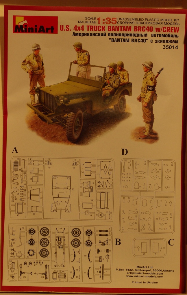 Добрый вечер. Представляю Вашему вниманию обзор модели Симферопольской фирмы MiniArt U.S. 4x4 truck bantam 40 brc w/crew. Модель упакована в картонную коробку с качественным принтом. Инструкция хорошего качества, цветная. Литники - каждый в своем пакете. Литье...тут все в комплекте и облой и толкатели. Правда нужно сказать, что количество и, если можно так сказать, качество их не критично. Собираемость - не знаю, еще не пробовали. В целом, при цене в 170 грн. не самый плохой вариант.
