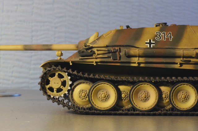 Изкоробочная версия Jagdpanther, без исторической привязки. Отличный набор, наборные траки, стеклянные перескопы и фары, травленые сетки, плетенные тросы. Окрашено все аэрографом, акрилом Tamiya, смывка акрил звезда, тонировка пастель. Детали стыкуется на отлично почти все. Из минусов можно сказать мне неочень понравился пластик хотя он и не ломается но твердый (быстро тупились лезвия). Надо быть внимательно с местами навешивания запасных траков (у меня они туда просто невставали пришлось их растачивать, чего честно неожидал от такой модели), а также их криплением даже после окраски аэром шпильки держушие траки невозможно было вставить (придется либо их делать из проволки или пытатся увеличить отверстие). Ведушие колеса зубци нелезут в траки после окраски (зубцы необходимо подточить там даже не в окрашеном состояни они впритирку). Вот такие трудности в сборке вызвала у меня это модель. Хотя это нетрудности просто неожидал еще раз повторюсь от Dragon таких как я счетаю недочетов. Про минусы это мое субьективное мнение и может ктото сним несогласен спорить небуду.