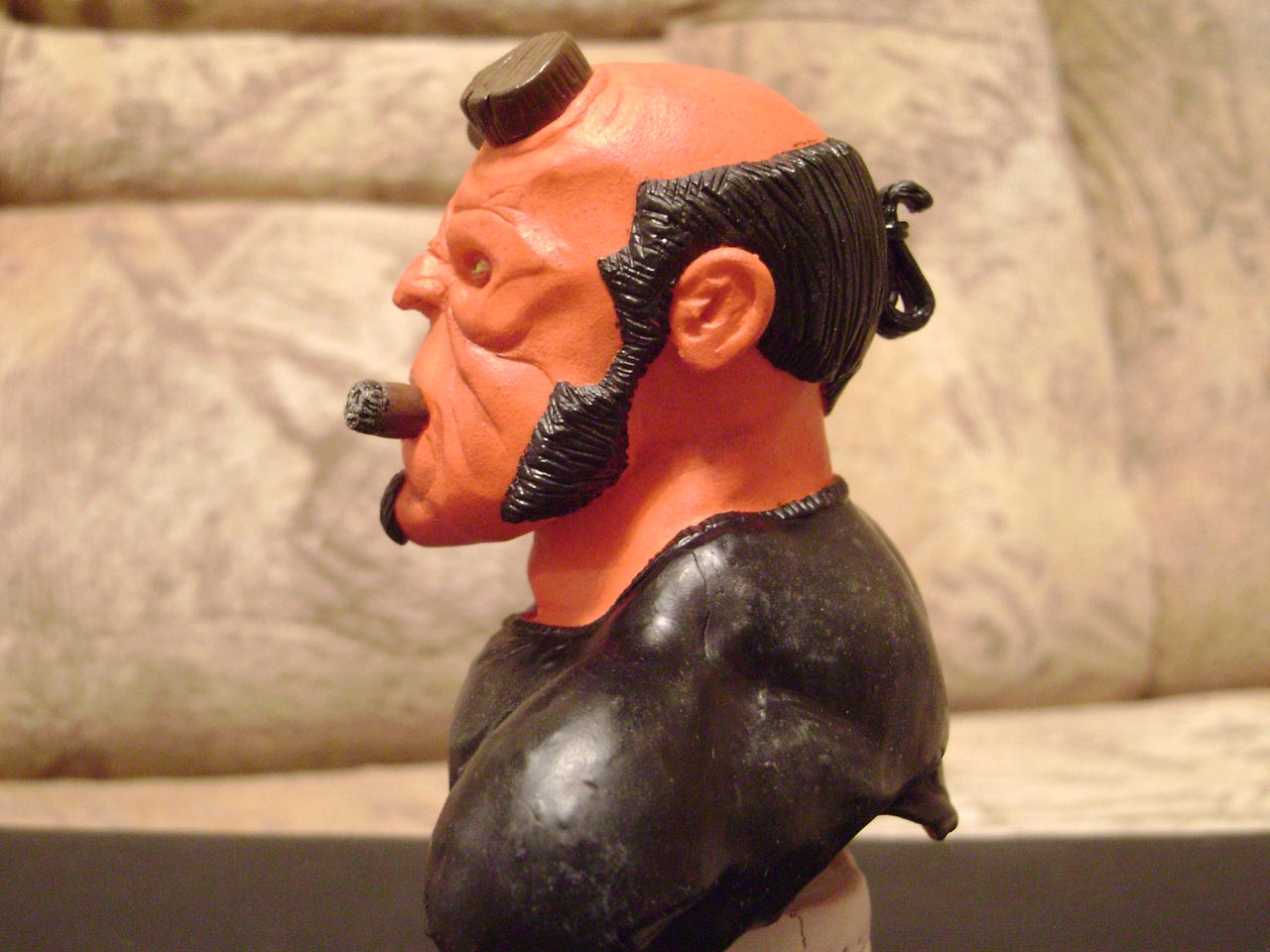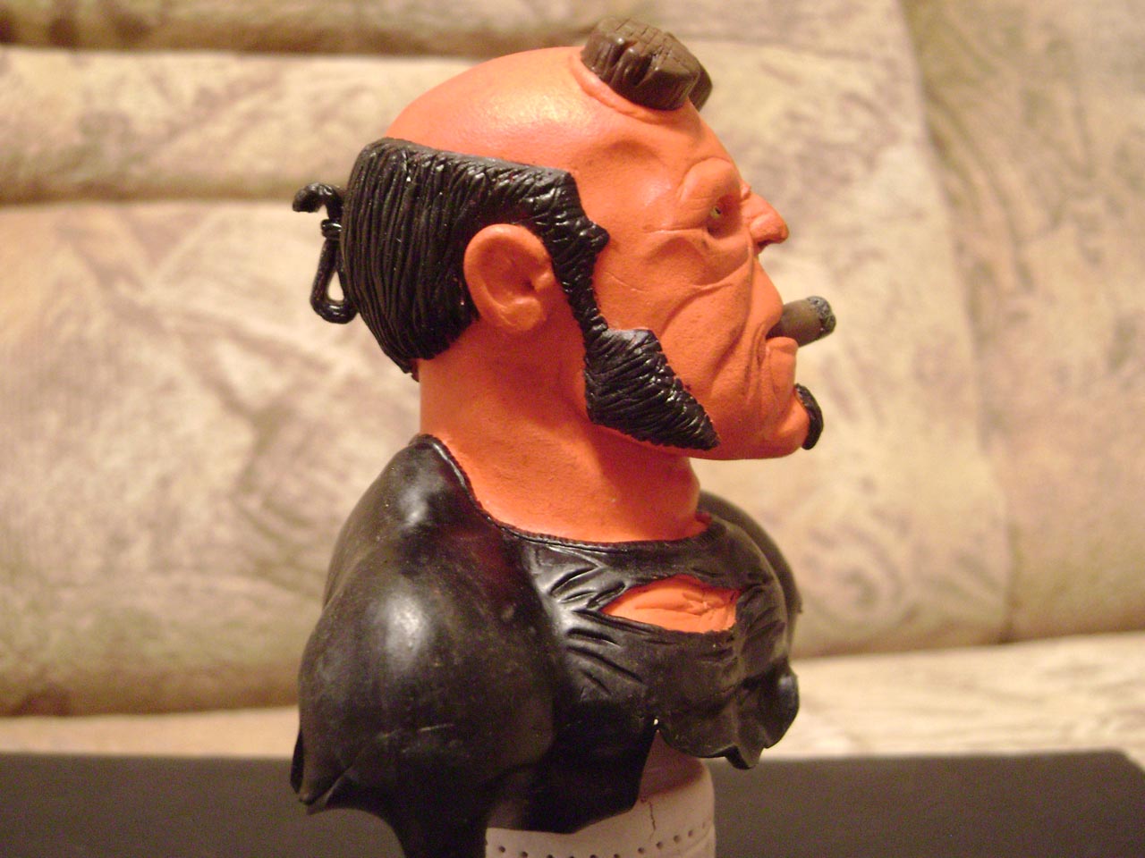 Прикольно! Но впечатление двоякое. Как к скульптору к Вам претензий нет, очень колоритный персонаж. А вот покраска слабовата (росписью это назвать еще рано). Все абсолютно однотонное, надо добавить полутона, тени. Да и бледноват он что-то. На сигаре под пеплом надо показать тлеющий огонь. Успехов.
