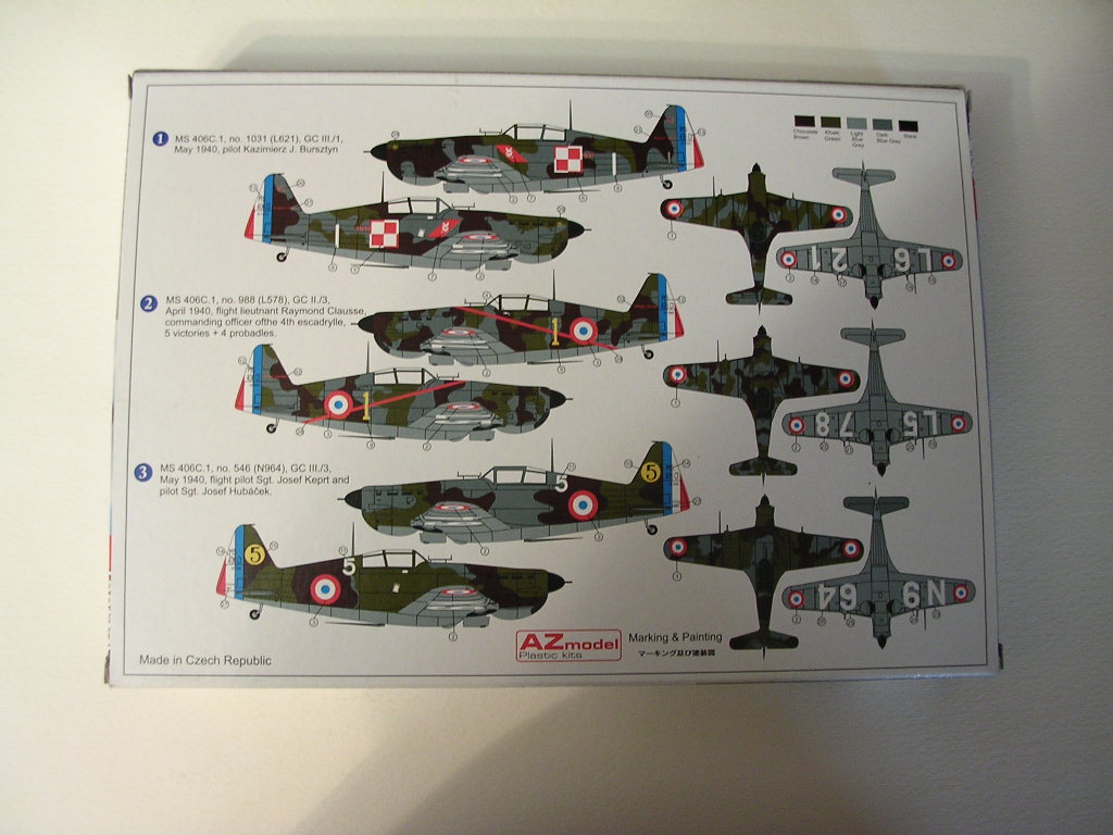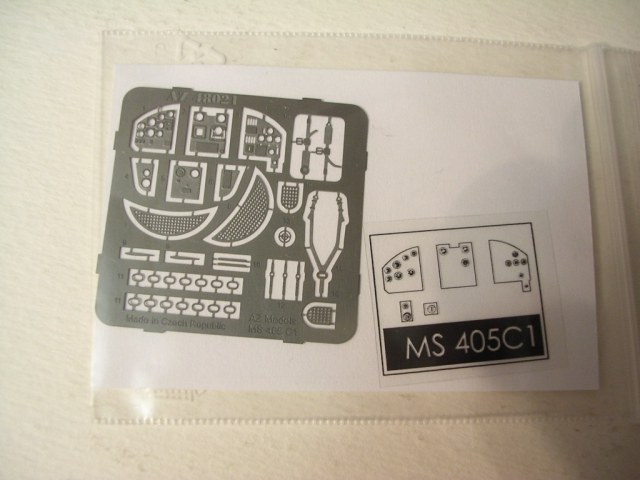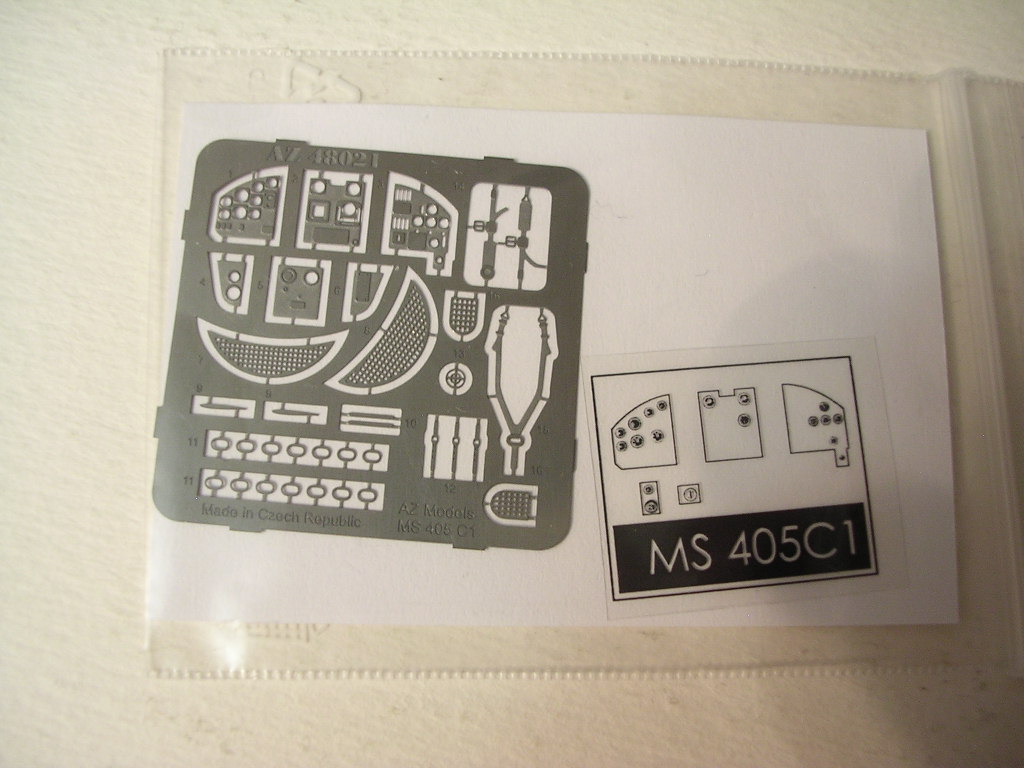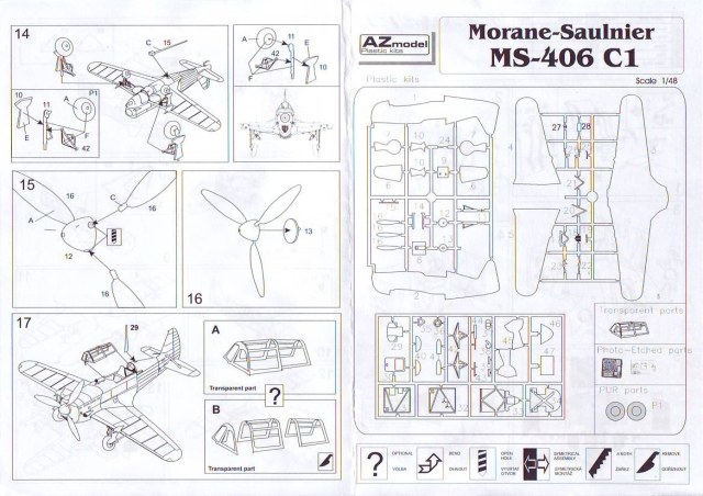 Итак модель французского истребителя Morane-Saulnier MS-406 C1,масштаб 1\48,производства чешской фирмы AZmodel.Набор включает в себя три литника серого пластика ,небольшую плату фототравления с решётками радиаторов,привязными ремнями,приборной доской и имитацией выходов выхлопных патрубков,плёнку,с напечатанными приборами,смоляные колёса(довольно среднего качества),фонарь,инструкцию и декаль.