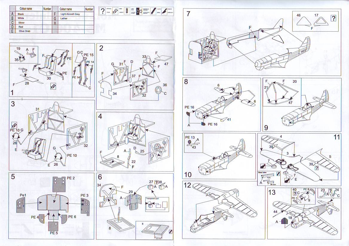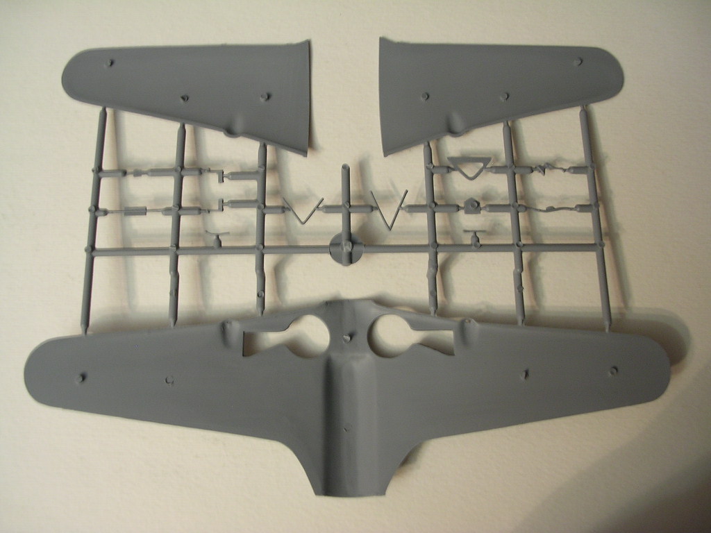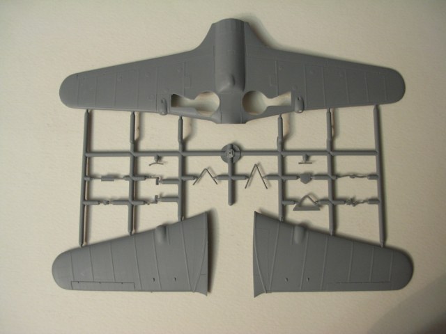 Пластик средней твёрдости,шероховатый на ощупь,недоливов и утяжин нет,присутствует мелкий облой.Расшивка внутренняя ,тонкая и аккуратнаяНа поверхностях неплохо имитировано провисание полотна и клёпка.Задние кромки крыла и руля направления толстоваты,придётся стачивать изнутри,задние кромки рулей высоты в норме, детали ,которые должны имитировать внутренности кабины слегка оплывшие и замыленные.Фонарь мутноват и ему не помешает полировка и слой футуры.Инструкция на листе А4,сложенном вдвое,довольно понятная.Декаль на первый взгляд хорошего качества,лаковый слой тонкий,смещений цветов нет.Даны три варианта окраски времён Битвы за Францию.