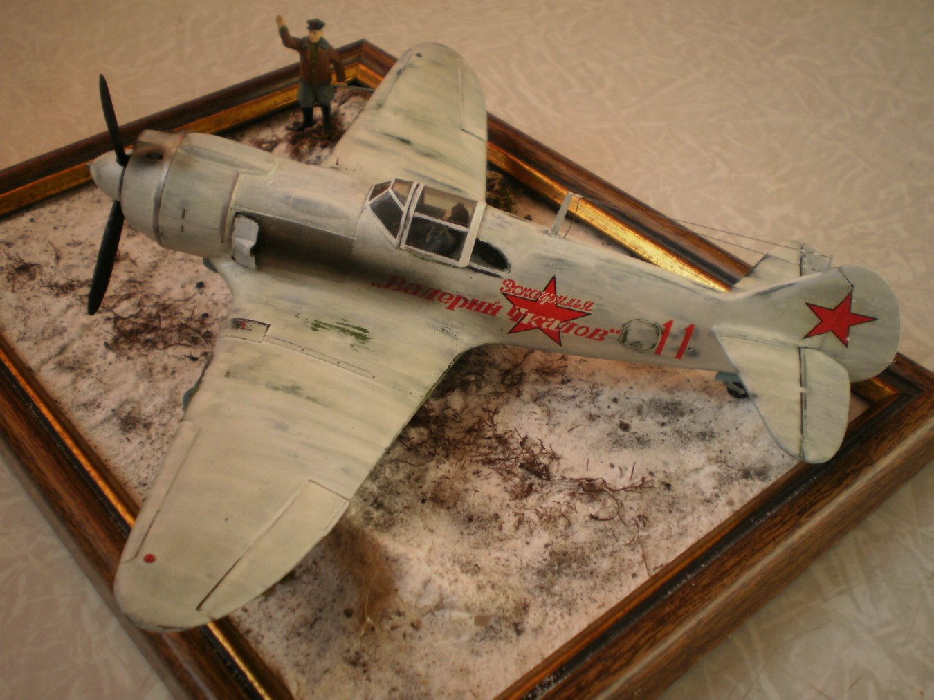 Мне в общем понравилось , вот если бы немного побольше по размерам сделать основание , то я думаю смотрелось бы намного лучше , чтобы крылья не " свисали " над рамкой . А так как-то сжато всё выглядит . Ну и конечно где следы от колёс , нагруженность их же не сделана . Сам Ла-5 понравился , качественная аккуратная покраска , по матчасти ничего не скажу , самому впереди предстоит сборка .
