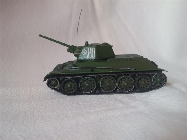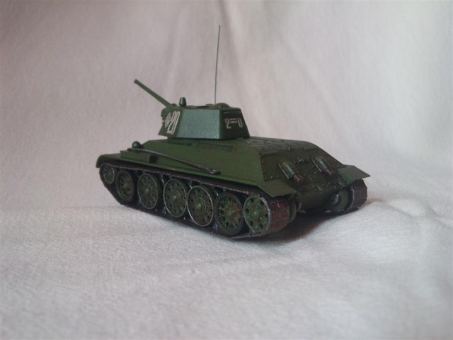 Первый опыт в постройке танков, собираемость хорошая, красил кистью звездой, далее автолак, смывка(акрил и фейри), рассверлил иголкой от шприца ствол, выхлопные патрубки, вставил антенну из медной проволоки, также из проволки попробовал сделать некое подобие поручня.