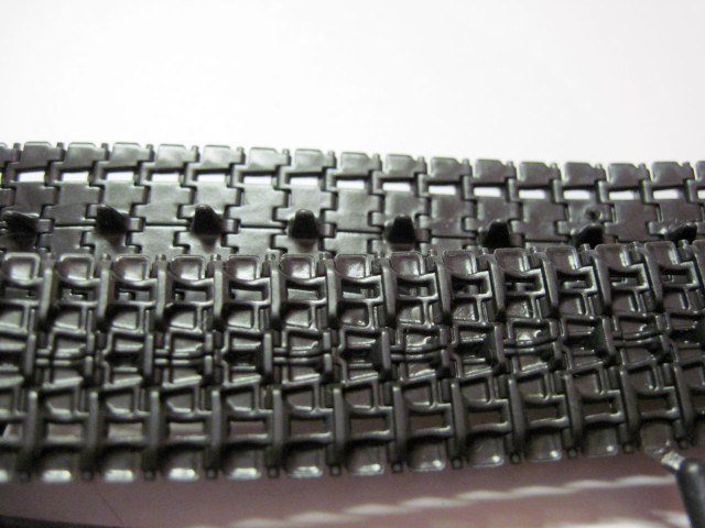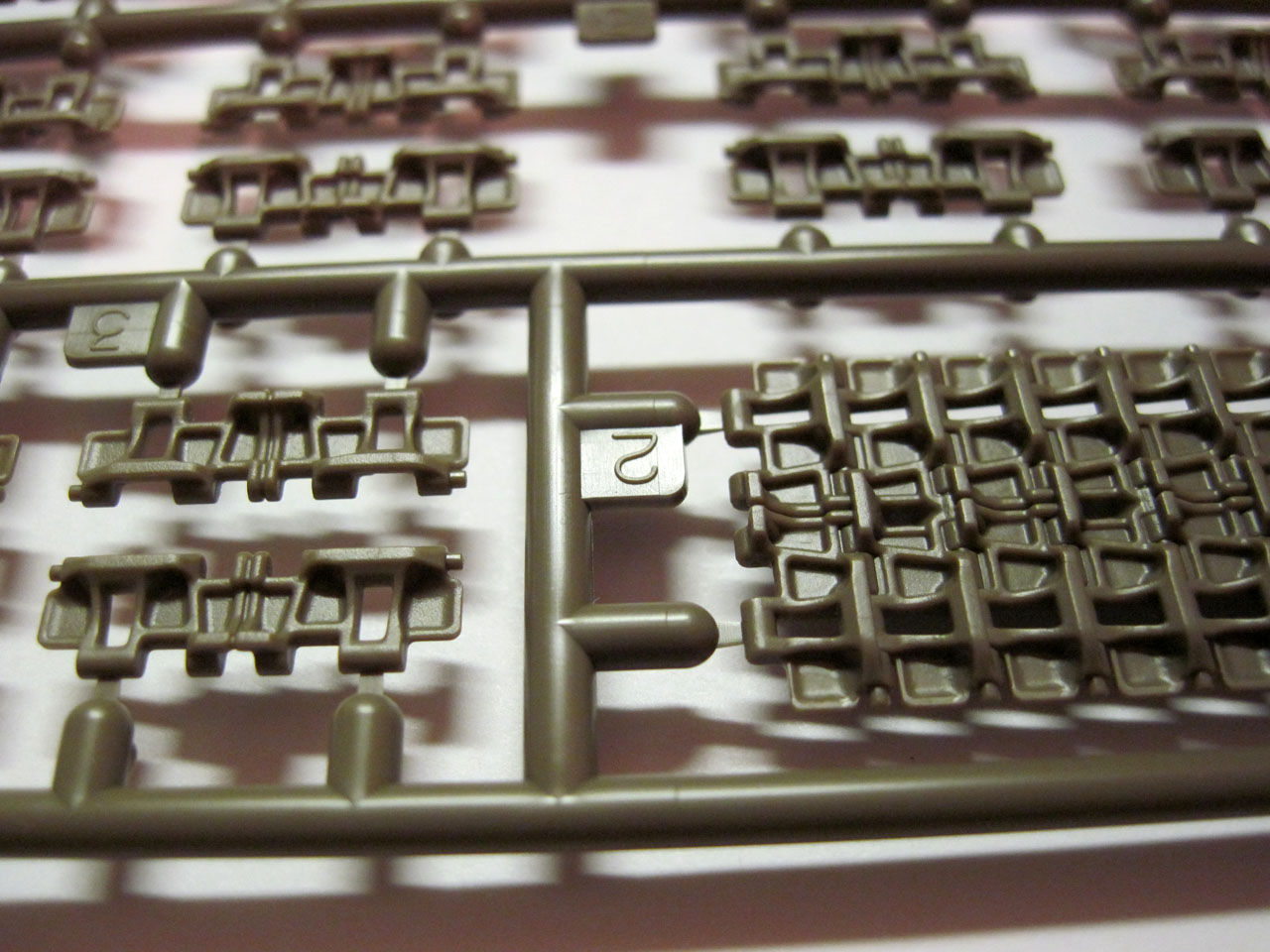 - Наборные гусеницы включают как и прямые участки, так и отдельные траки (для создания верхней ветки гусениц с провисом в наборе есть пара специальных приспособлений). На траках присутствуют следы от толкателей.