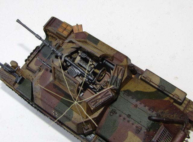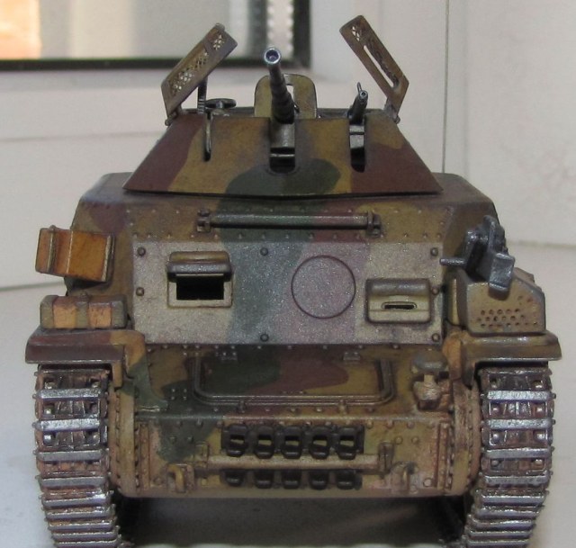 Собирал из коробки. В инете сведений и фото довольно мало. Собирался хреново. Очень много пришлось точить, особенно гусеницы. Из доработок антенна из проволоки, Сетка защиты от гранат противника из ситечка. Красил акрил от "Звезды". Фильтр масло + уайт-спирит, смывка - АК.