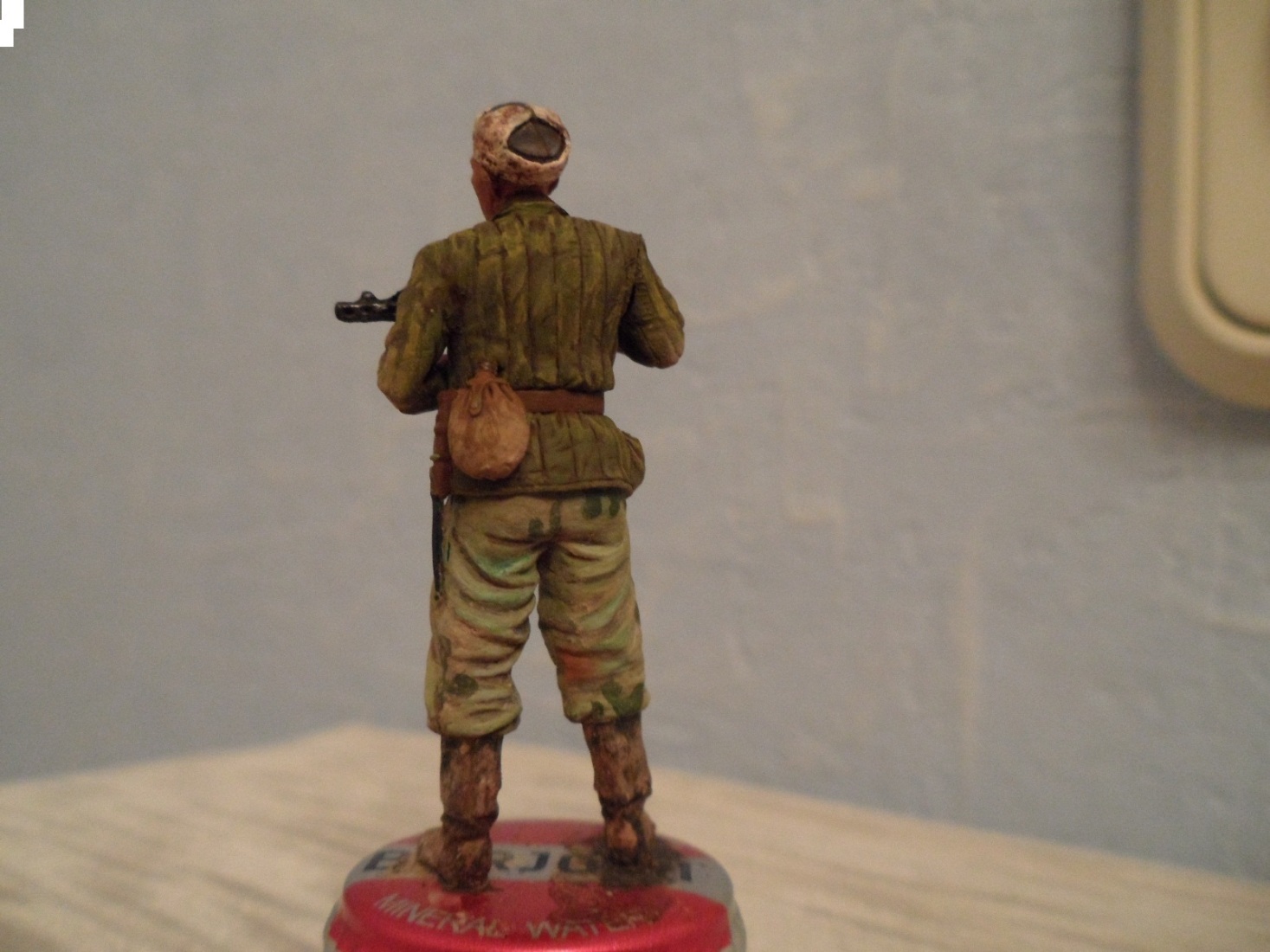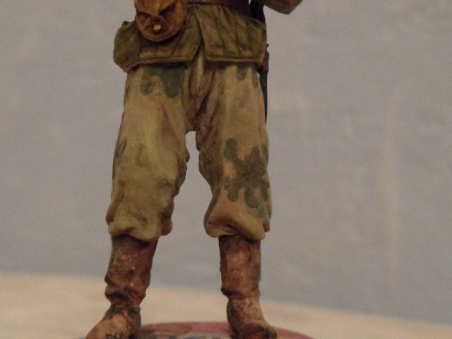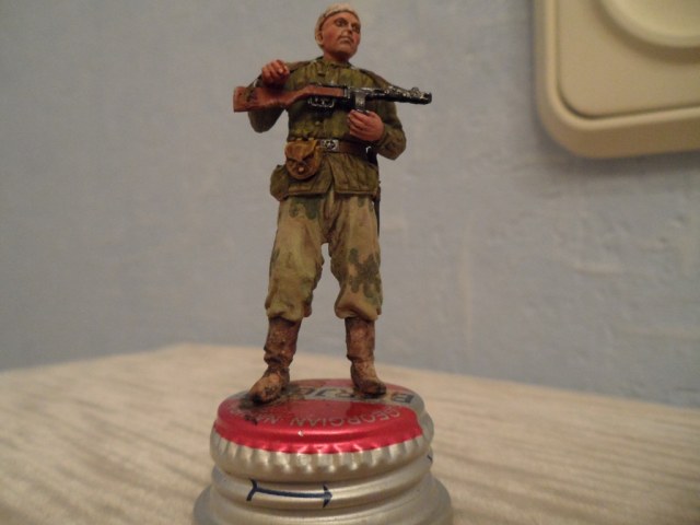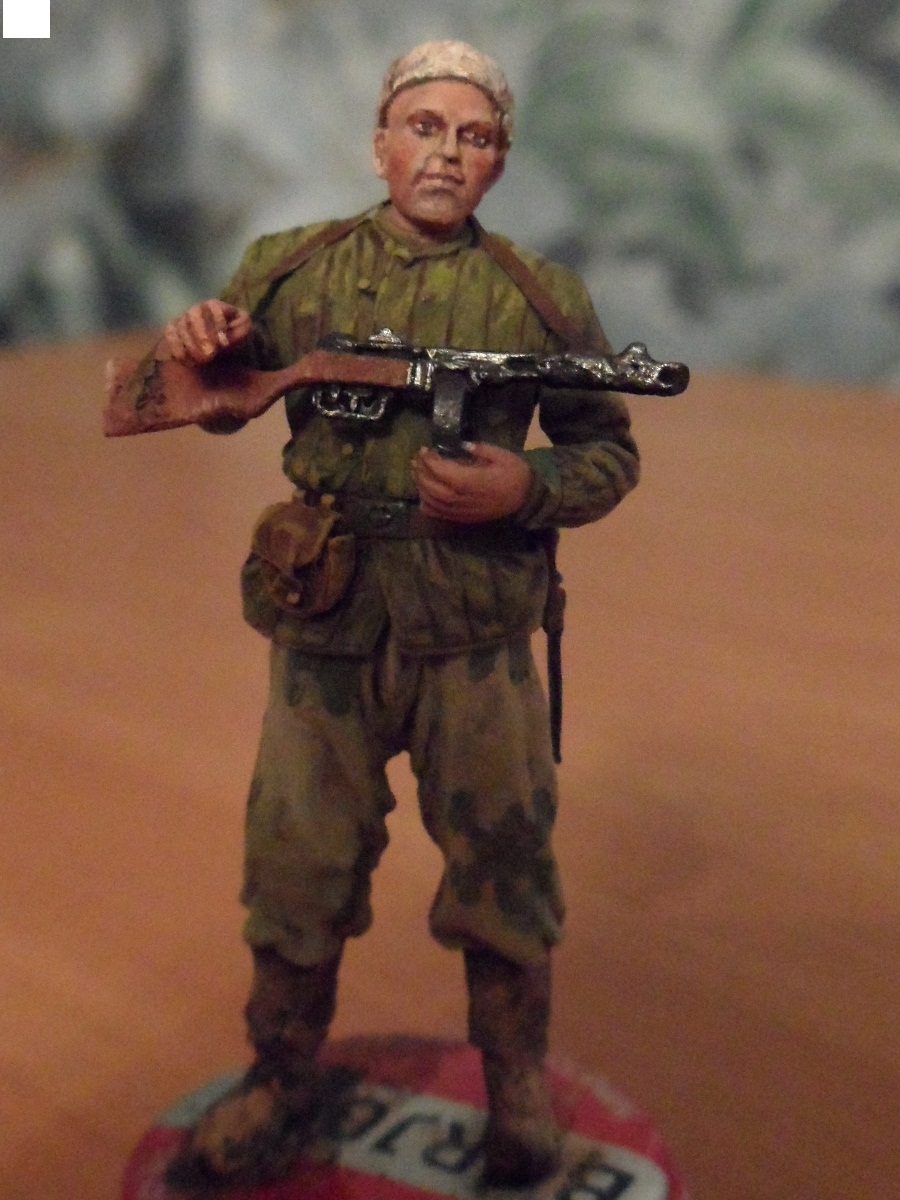 Неплохая фигурка, форма и снаряжение очень понравились (единственно, мне кажется, все-таки рисунок камо у наших, вроде, был по-мельче), жаль ППШ испорчен. Лицо, конечно, можно еще подтонировать, на мой взгляд, но лучше об этом пусть спецы выскажутся.