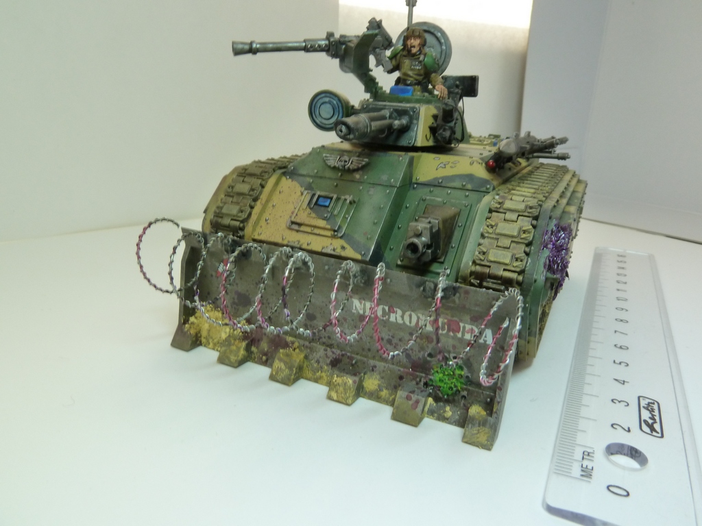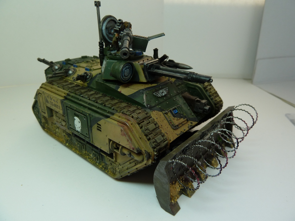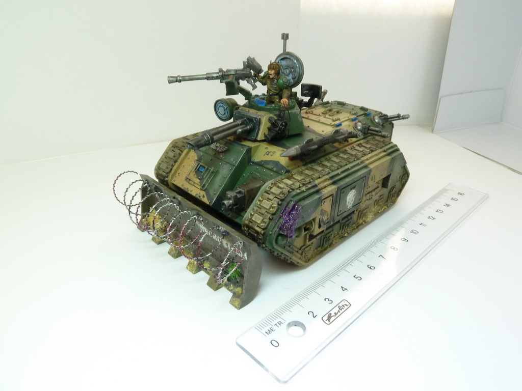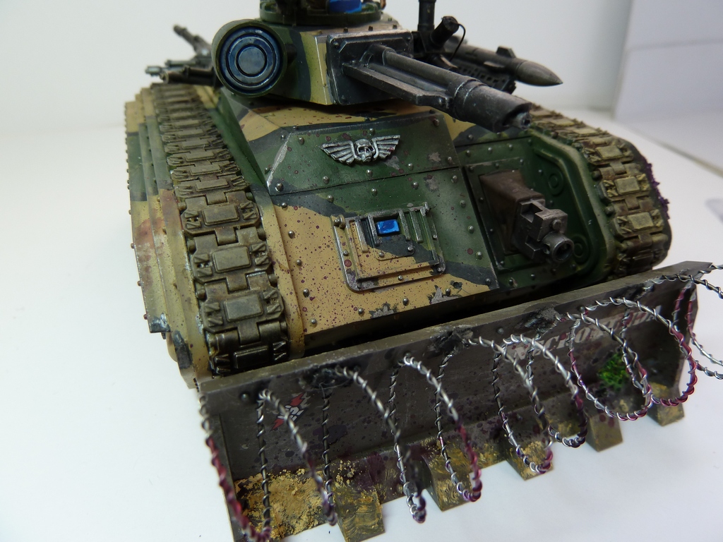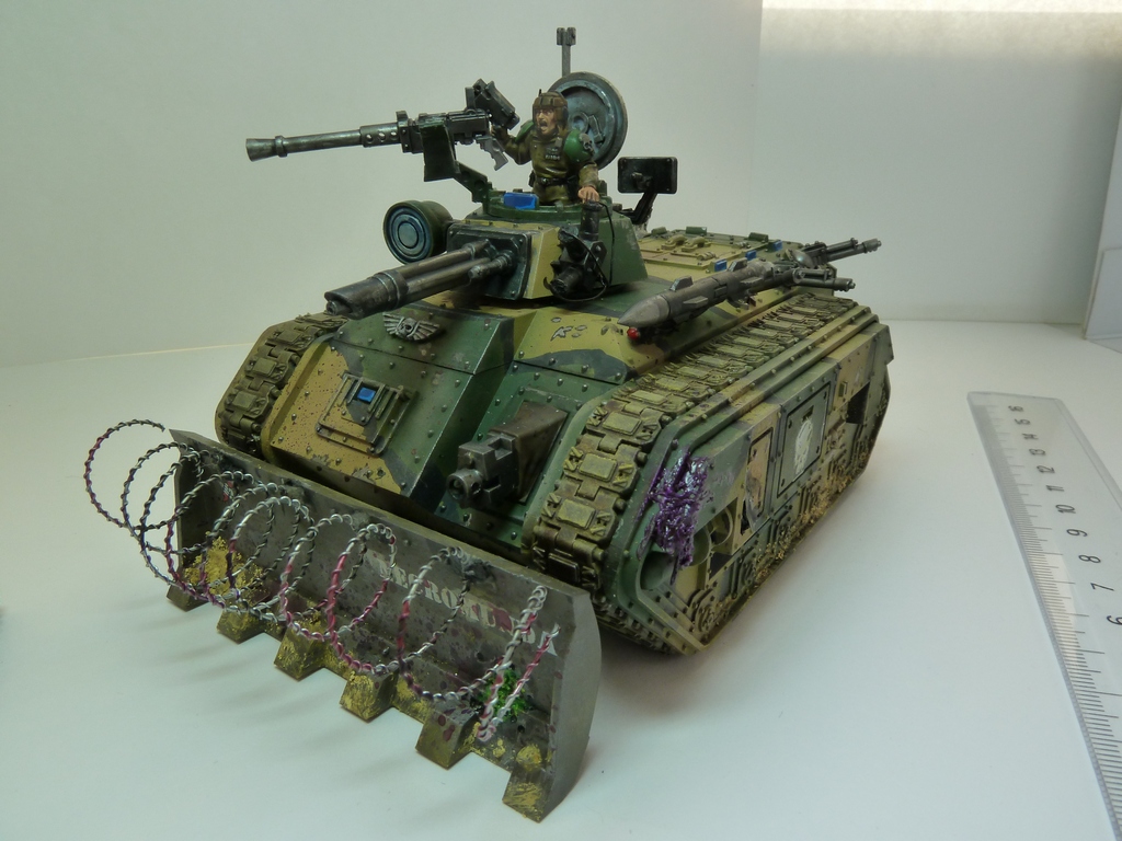 светлые сколы определяются исходя из матчасти вселенной ибо танки из какого-то металла по типу титана. колючая проволока оригинальная Games Workshop WH40k. экспериментировал с повреждениями.и пигментами.собирается еще проще БААЛА.выбрал самую большую пушку из набора для ствола.остальные аналогичны той что над отвалом.