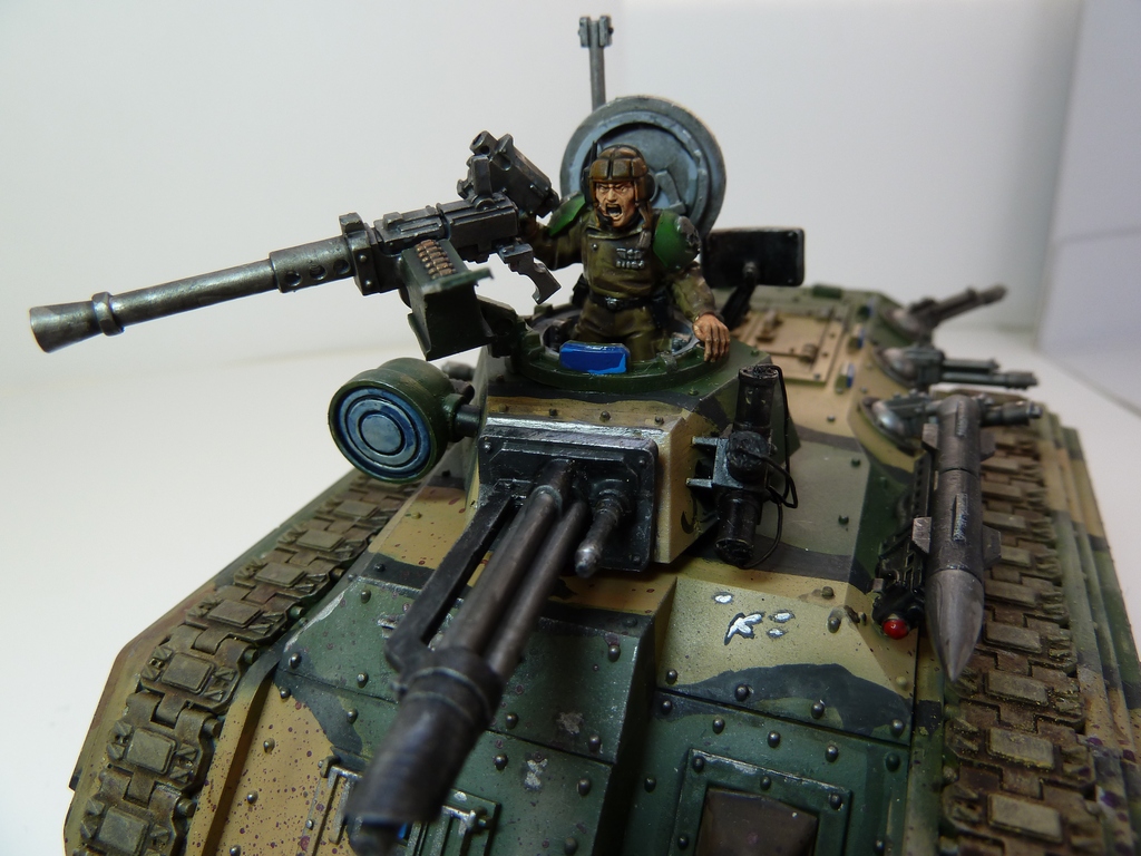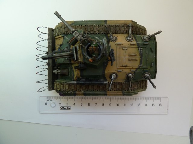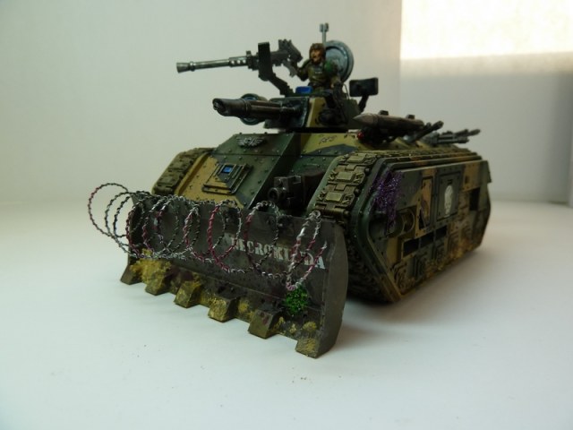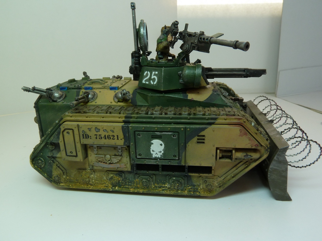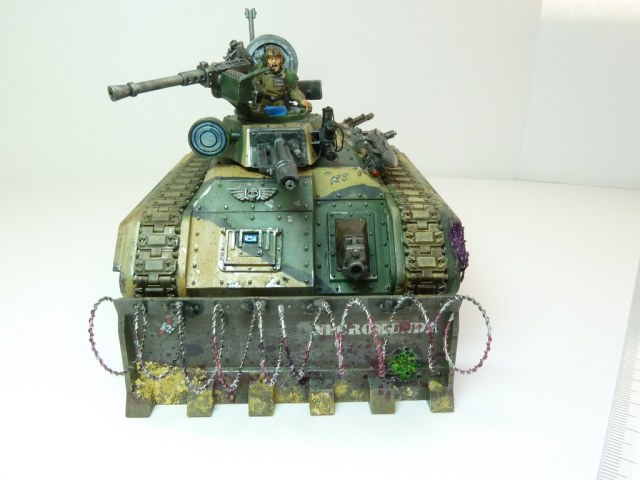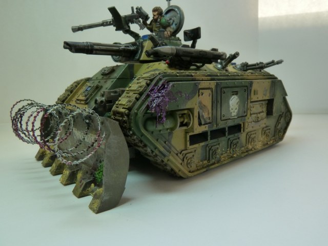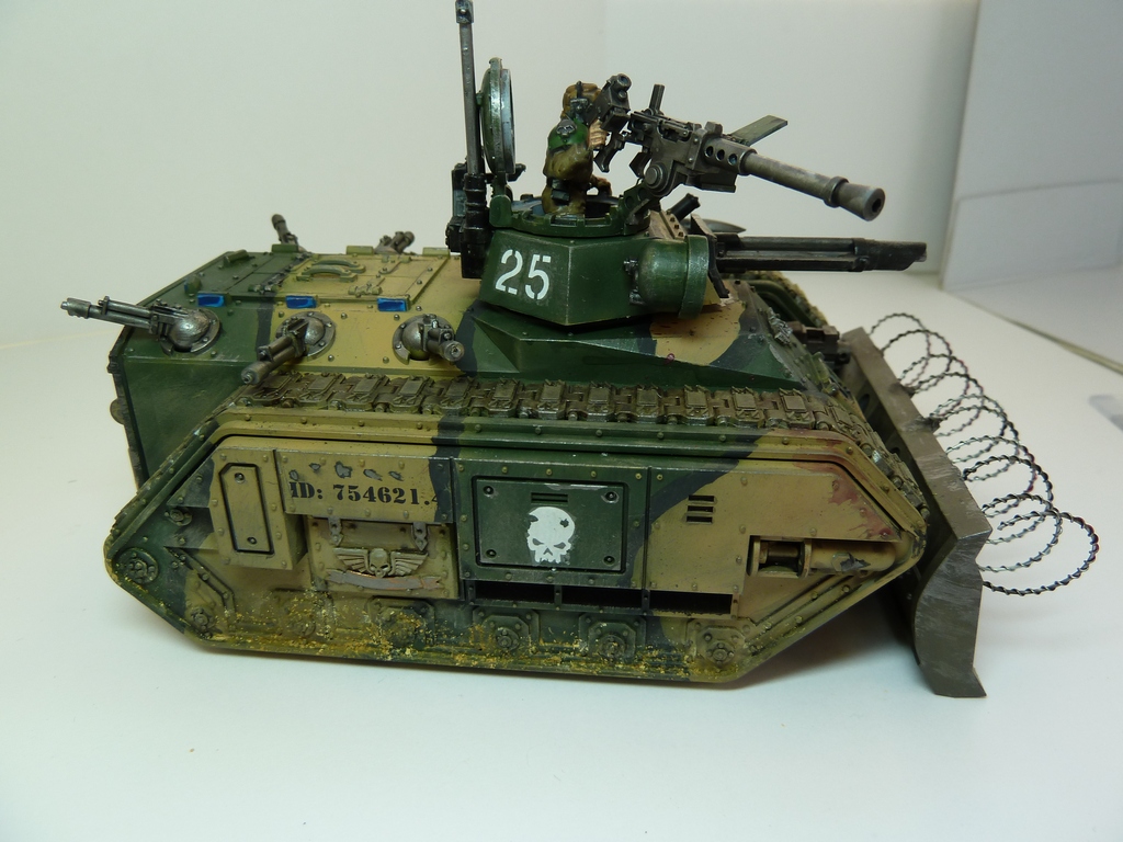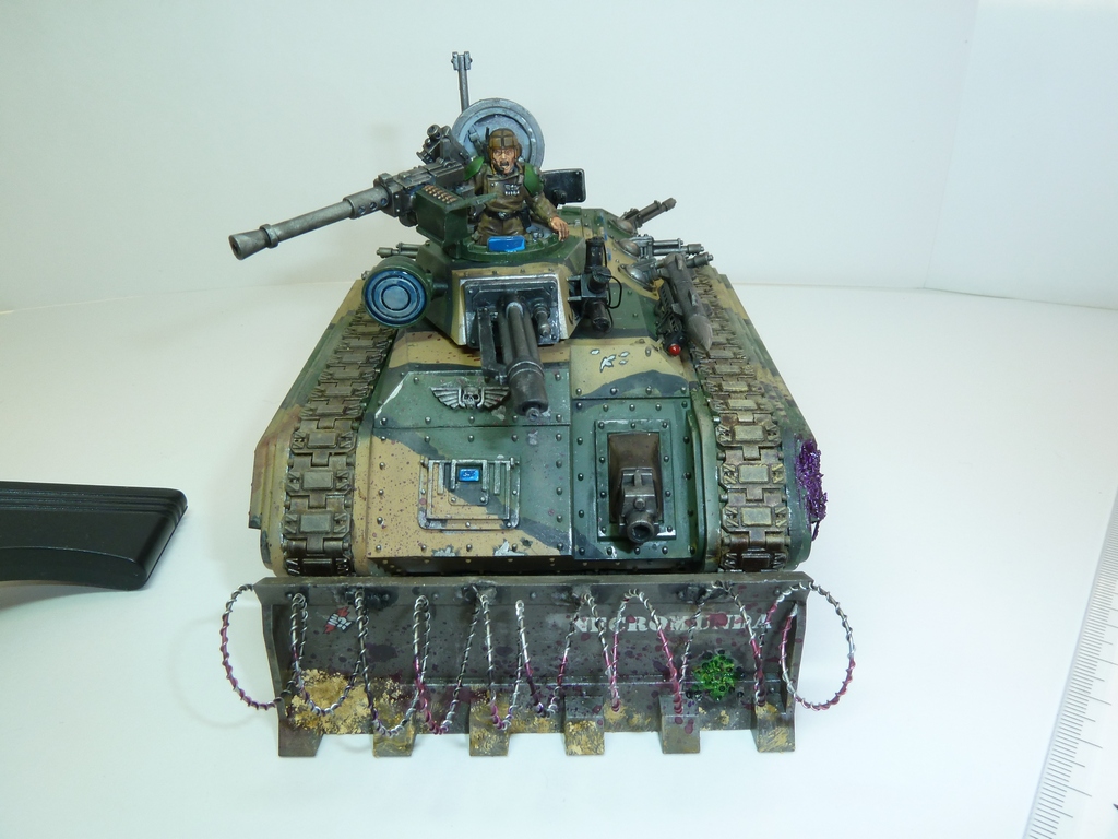 светлые сколы определяются исходя из матчасти вселенной ибо танки из какого-то металла по типу титана. колючая проволока оригинальная Games Workshop WH40k. экспериментировал с повреждениями.и пигментами.собирается еще проще БААЛА.выбрал самую большую пушку из набора для ствола.остальные аналогичны той что над отвалом.