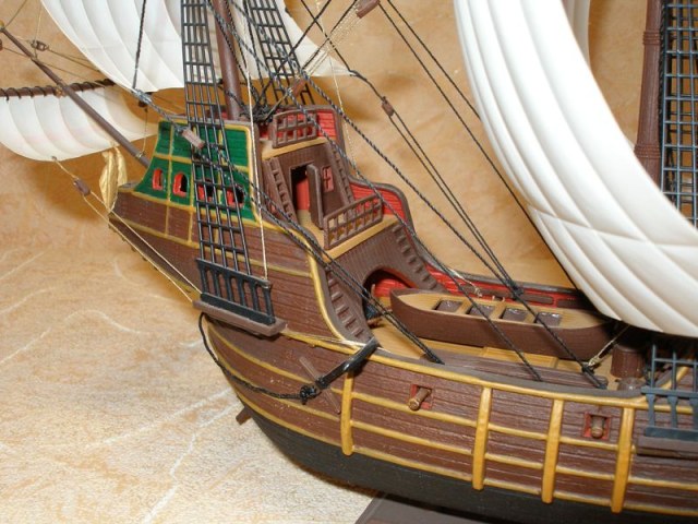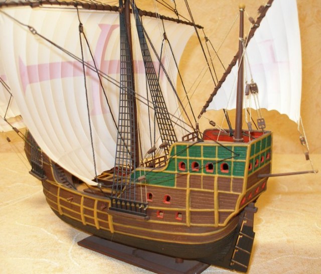 Модель корабля 16 века, на кораблях такого класса конкистадоры отправлялись покорять земли Нового Света. Корабль мог принять на борт до 900 тонн груза при водоизмещении 1600 тонн и мог перевозить 600-700 вооруженных человек. Для своего времени этот корабль был хорошо вооружен, на него устанавливалось 10 корабельных пушек и фальконетов. Масштаб 1/100.