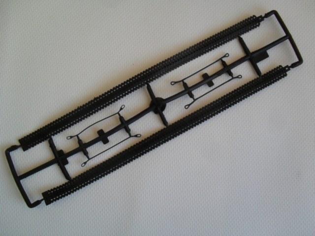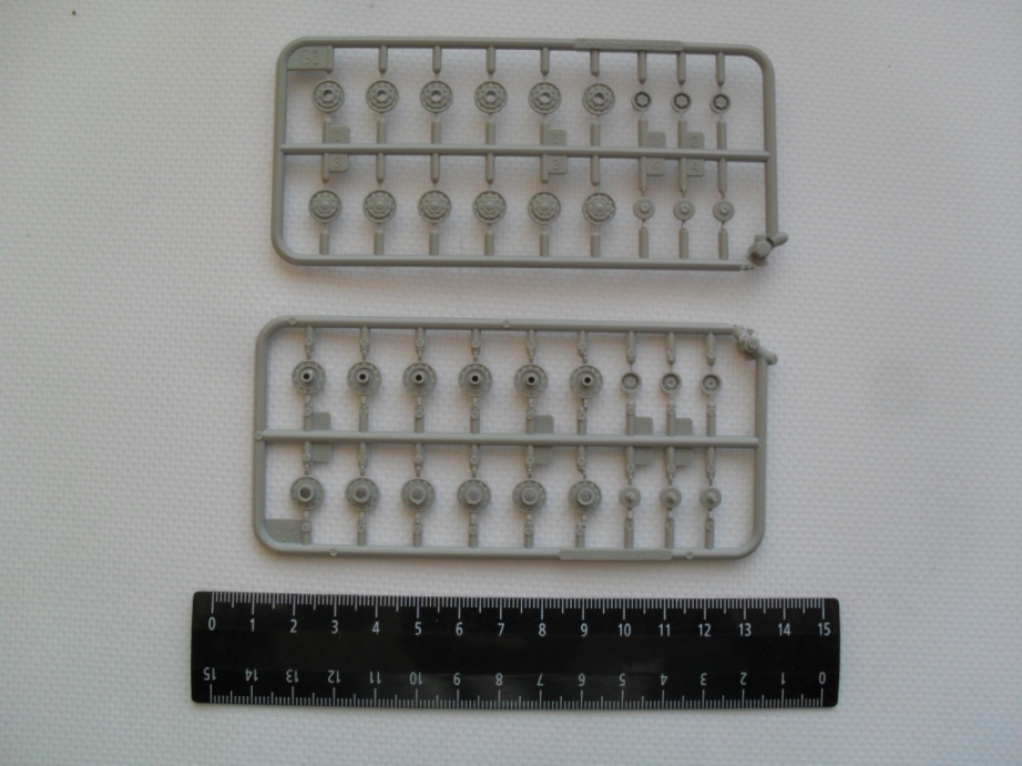 В картонной коробке размером 250*160*50мм на 5 литниках серого пластика размещаются 82 детали. Качество отливок в целом можно признать хорошим. Присутствует незначительный облой, следы от толкателей расположены на литниках и внутренних поверхностях деталей корпуса и башни, на стволе орудия шов от смыкания пресформ. Утяжек и недоливов нет.