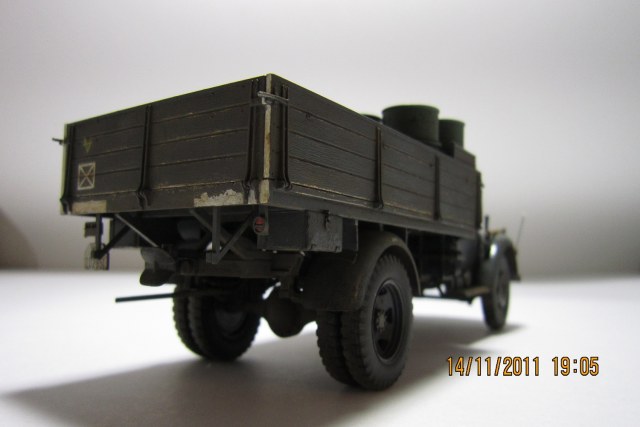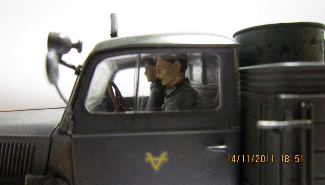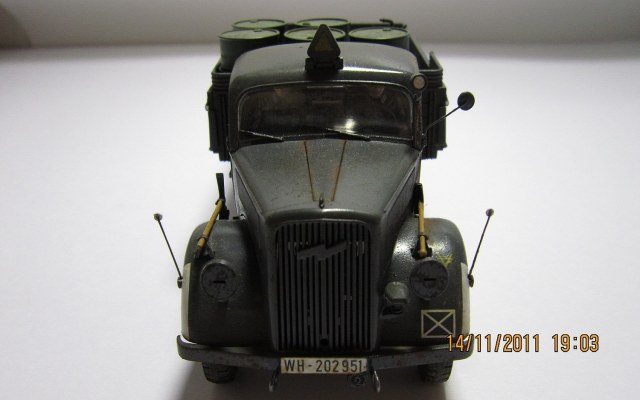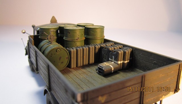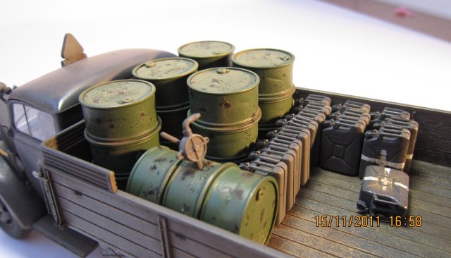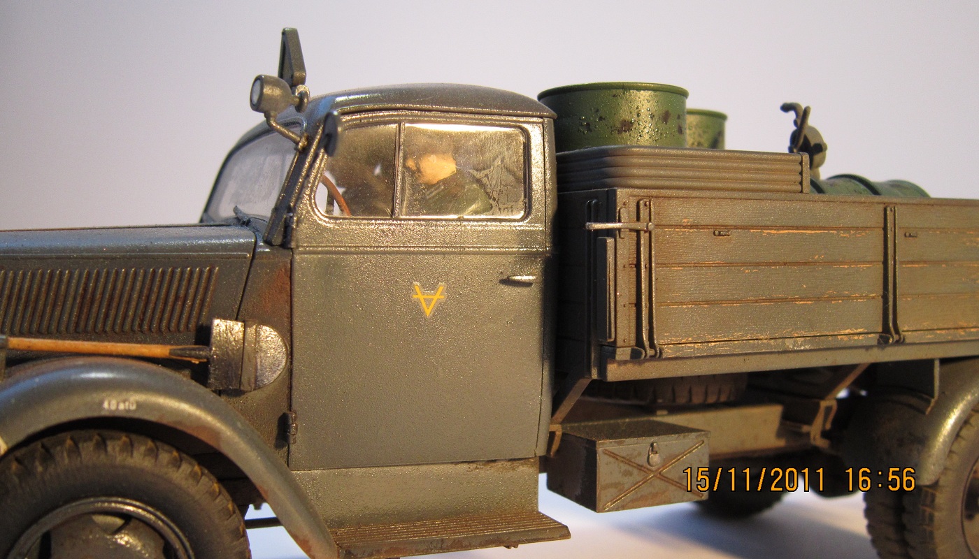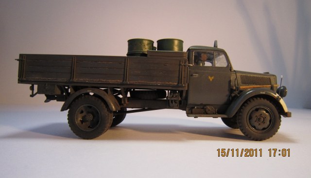 Сам Опель Блиц от Тамии-модель довольно хорошего качество... Единственное чего не хватает-так это двигателя...Фотографии немного темные да и мало их. У меня вопрос по бочкам с топливом.. А разве они не должны быть серого цвета?