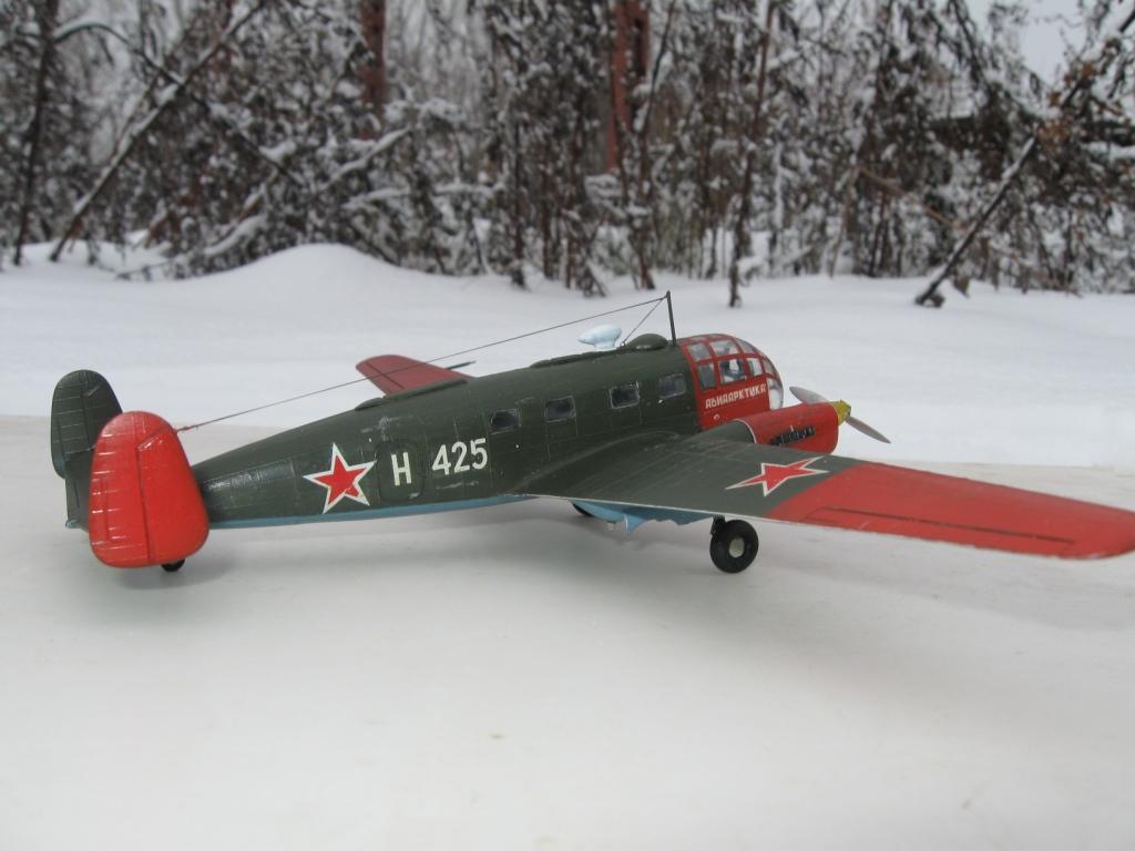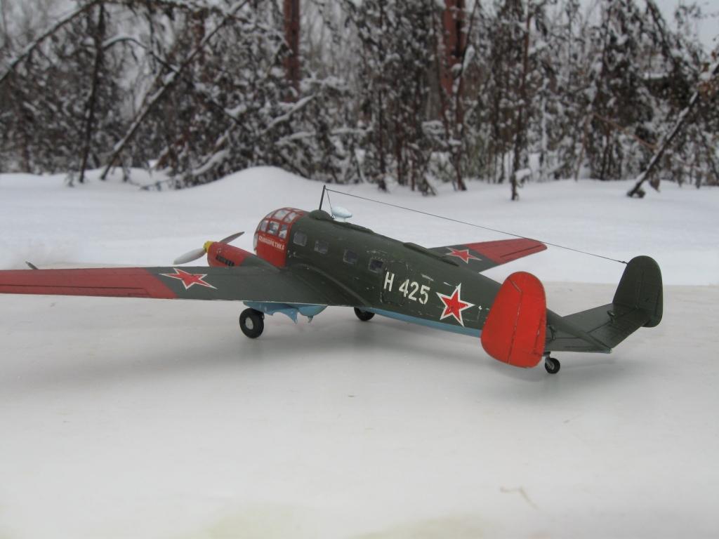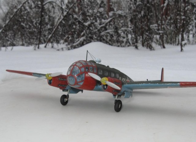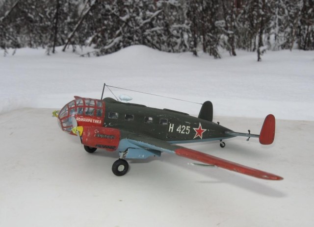 Я решил вопрос с окраской несколько по-своему.Зелёный защитный-как окрашивались большинство Ли-2 ГА,плюс ярко-красные части крыла,шайбы килей с наружной стороны,капоты двигателей и носовая часть фюзеляжа,т.е.сделал самолёт максимально заметным на снегу из стандарного зелёно-голубого.