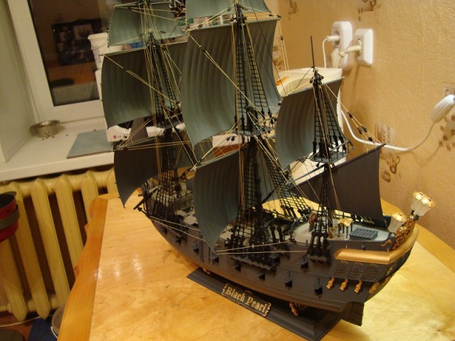 Как всем известно, "Жемчужина" - пиратский корабль. В ней меня заинтересовала её мрачность и загадочность, поэтому выбор был сделан очень быстро (благодаря подсмотренным на Каропке двум собранным моделям). Собиралась очень хорошо, качество литья на уровне. Получил огромное удовольствие от работы, особенно от протяжки такелажа. Трудно, но зато красиво и приятно! Покраска осуществлялась кистью (аэрограф сегодня уже заказал) с применением "звездовских" акриловых красок (в моём городе выбор невелик). По времени сборка заняла 3 недели. Получил бесценный опыт, далее планирую остаться в морской теме.