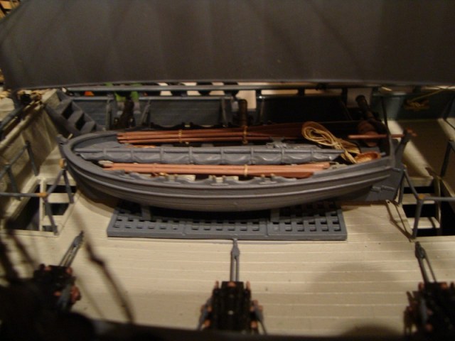 мне показалось, что корпус с парусами вообще не крашен. также дверцы пушечных портов "Звезда" предлагает подвязывать нитками, странно, что здесь этого нет. также я покрасил бы решетки фонарей черным, совсем другой вид будет.