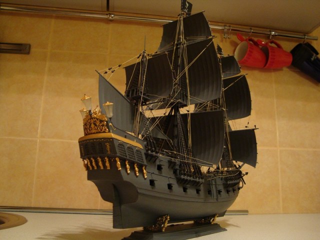 "Бочка дегтя" - "В ней меня заинтересовала её мрачность и загадочность" - согласен, но у черного и серого цветов то-же есть оттенки, которые могли бы добавить модели "живости"... Пока она абсолютно "без изюминки"... "Бока" такелажа перечислять не буду, ибо тогда нужно переделывать всю модель, что считаю абсолютно лишним. "Изкоробка" вполне удалась.