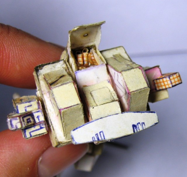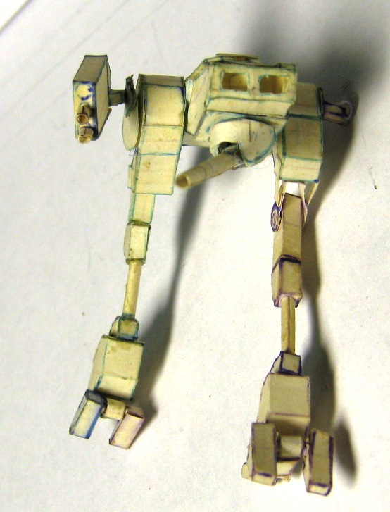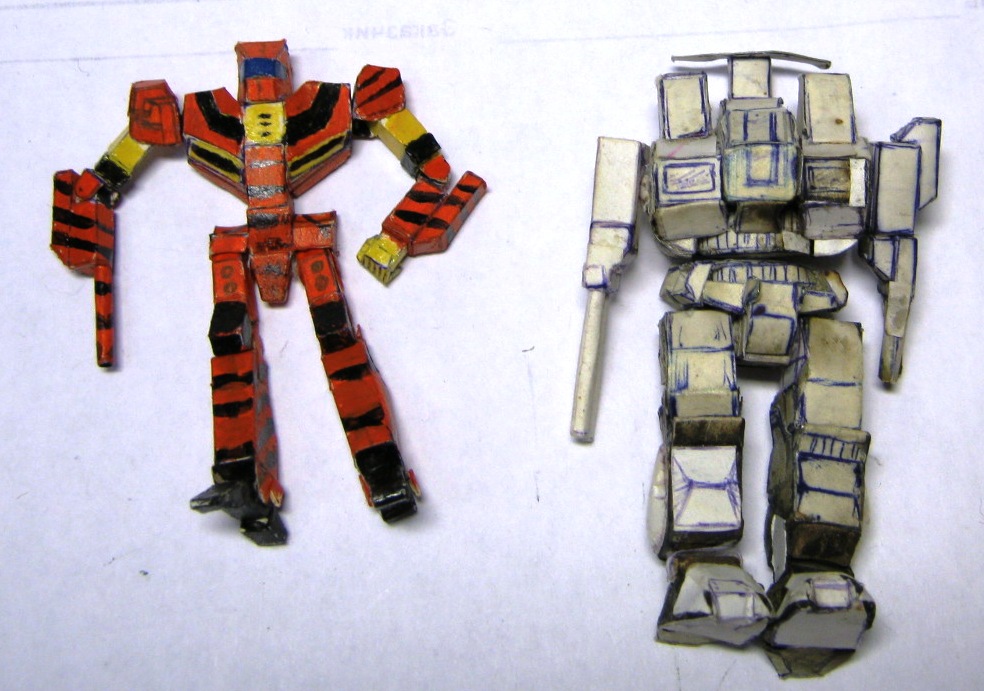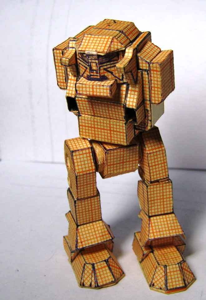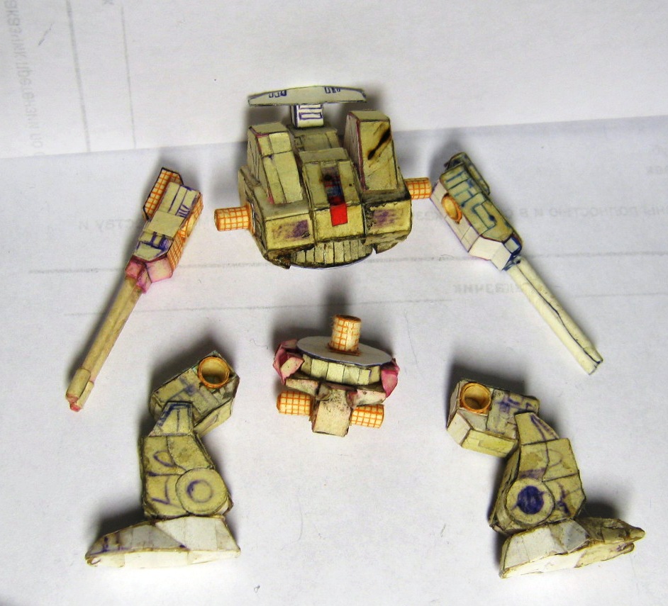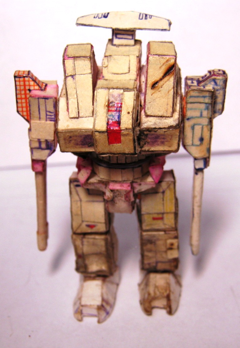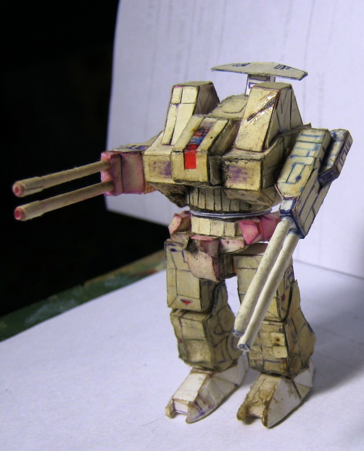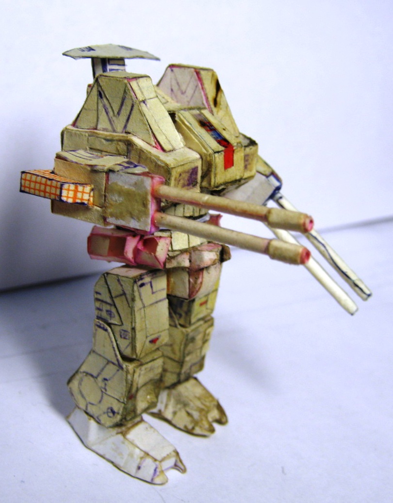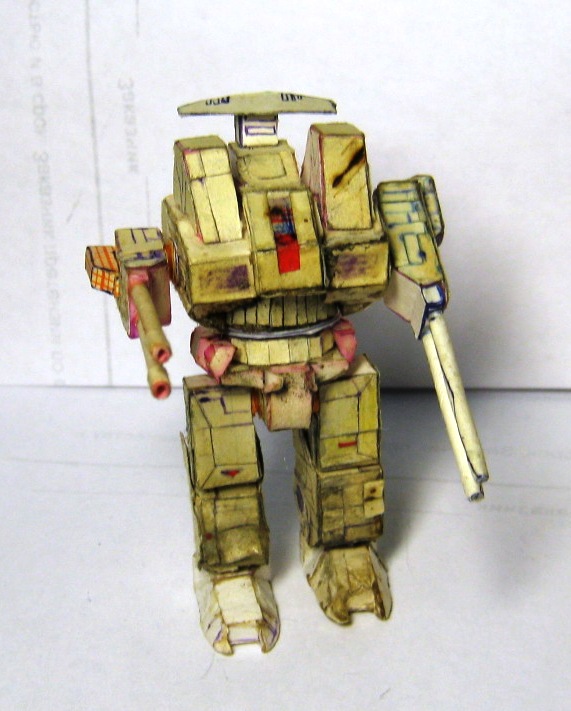 В период 14-18 лет, ориентировочно, увдекался изготовлением мехов из бумаги по собственноручно разработанным чертежам. в каждой части робота содержится большое количество элементов, все шарниры старался делать подвижными. Затем с братом мы "воевали" с помощью пиротехники этих роботов взрывали, поджигали. Потом чинили. Результат налицо. Забросил заниматься после школы. Спуся 14 лет роботов нашли мои дети,, не много порушили. И вот на волне возникнувшего интереса к баттлтеху я их достал и начал восстанавливать.