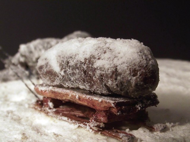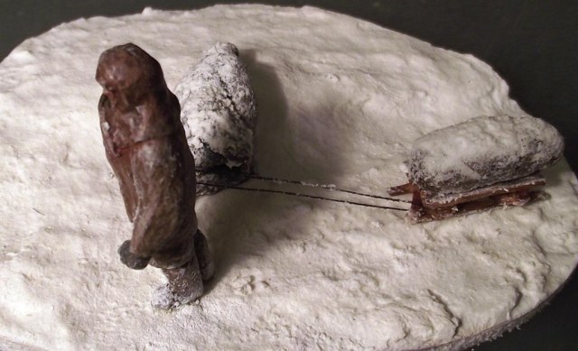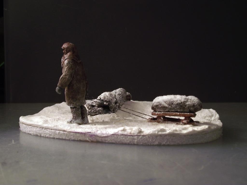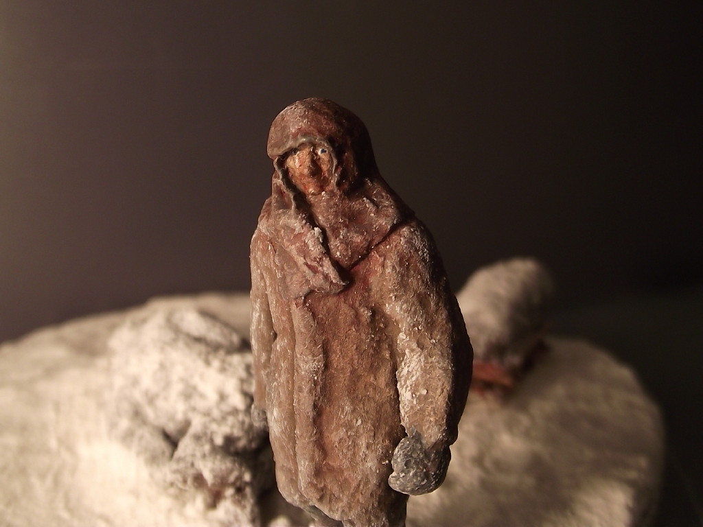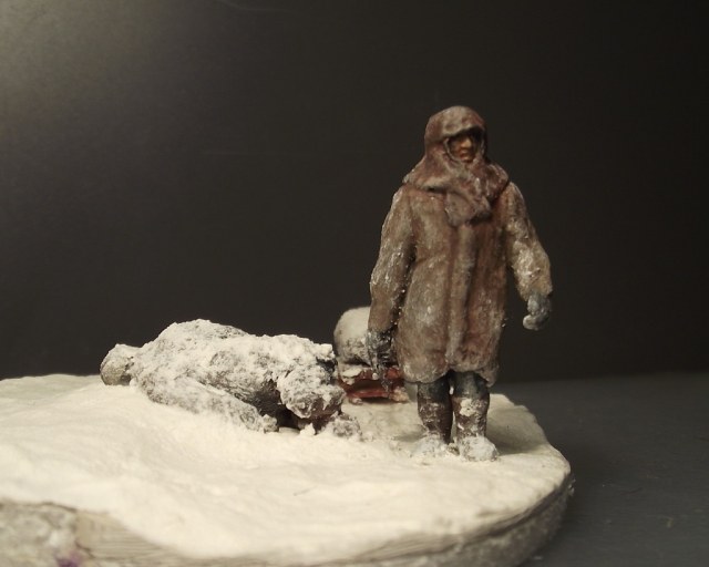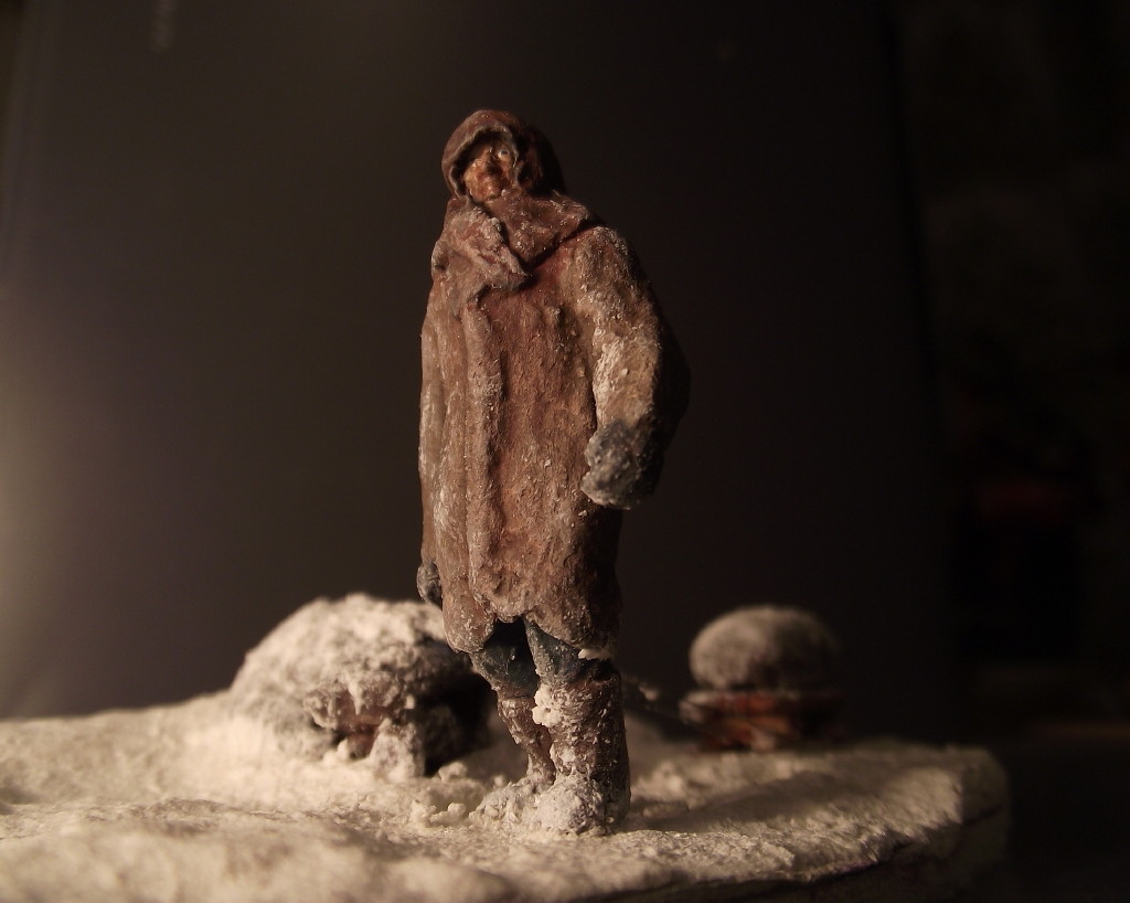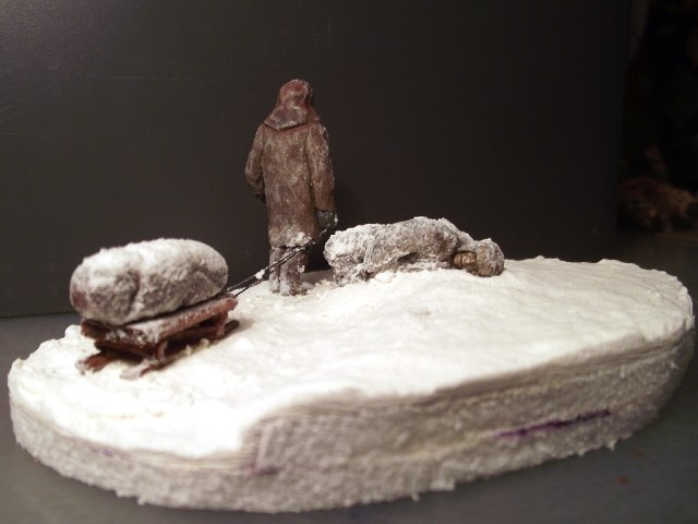 После просмотра фильма "Ленинград" захотел сделать диараму, но все откладывал на потом и недавно решился. Фигуры замерзшего и везущего санки - "немецкие парашютисты"("Звезда"/Italeri) . Оклеены смесью ПВА и бумаги. С голов срезал ремни, сделал лица худыми, а скулы выпирающими, ноги у идущего распилил, а потом склеил, тем самым уменьшил рост, правая рука от советского пулеметчика. При склеивании ног замерзшего потребовалась шпаклевка и полистирол, руки от разных фигур из набора. Санки - спички, завернутый ребенок - все таже смесь ПВА с бумагой, на которой имитировал складки ткани. Снег - смесь соды, белого акрила и ПВА.