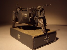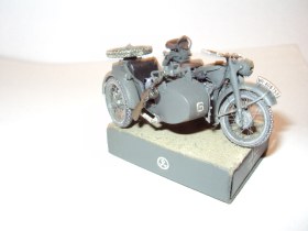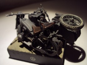 Модель собирал долго из за того, что мотоцикл упал с готовыми колесами и спицы были сломаны( на тот момент он был без коляски) пришлось покупать новый набор и делать спицы из тянутого литника на 80% и проволоки на 20% заново в итоге я сделал 6 колес . В коляске каска с очками, ппш и сапоги от солдат что были в наборе. Переделаны все пружины добавлены проводка, тросики и еще по мелочам.Подставка из спичечного коробка. Окрашен в серо зеленый... акрил из аэрографа.