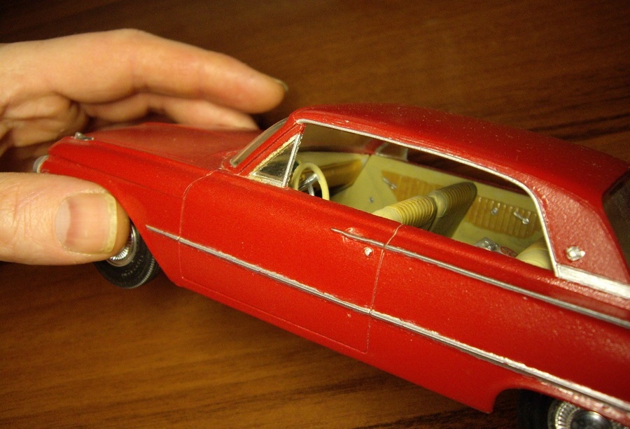 Добрый вечер всем Каропчанам! Решил выступить в несвойственной мне теме -автомобили. Немного предыстории. Классе в третьем мне удалось посмотреть фордовский автокаталог за 1957г. Сказать то, что у меня захватило дух, ничего не сказать. И вот, приблизительно в 97 году, мне попалась пластиковая модель Форд Гэлакси в 1/25! ( Конечно я уже клеил пластиковые машинки, помните , были старые "Дикси" ландо , торпедо и грузовик . Кажется в ГДР их делали. Они ещё продавались без клея. Но не красил я в те времена не только авто но и все другие модели). В наборе предлагалось три варианта сборки данной машины- базовая модель и два варианта с накладными деталями удлиняющими корпус, разными облицовками радиатора и светотехники ( передней и задней). Но для доработок требовалась модельная шпатлёвка и опыт работы с ней . Поэтому я собрал базовый вариант. Корпус красил двумя красками из баллончиков - " Хром" и Красная. Хромовая краска, после нанесения, стала алюминиевой, потеряла блеск. На все молдинги и панели я наклеил маски из бумаги на сахарный сироп. Во всяком случае в Моделисте- конструкторе такой рецепт печатали. Потом задул из красного баллончика. Самое интересное произошло потом, когда пришлось снимать маски. Сахарный сироп высох и очень хорошо прихватился к молдингам. Пришлось, после достаточно жёсткого отмывания, восстанавливать красную краску вдоль серебристых панелей с помощью заострённой спички. Бамперы и некоторые другие внешние детали были хромированы производителем модели. Но питатели деталей располагались таким образом, что это замечательное покрытие приходилось стачивать, убирая следы литников и питателей. Пришлось опят покрывать алюминиевым "хромом".
