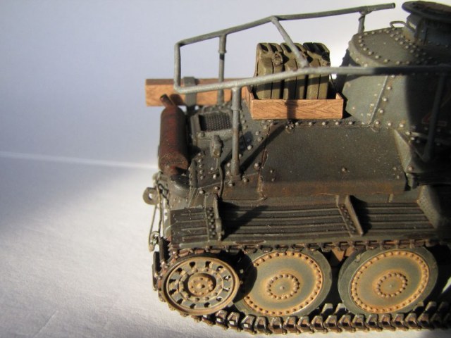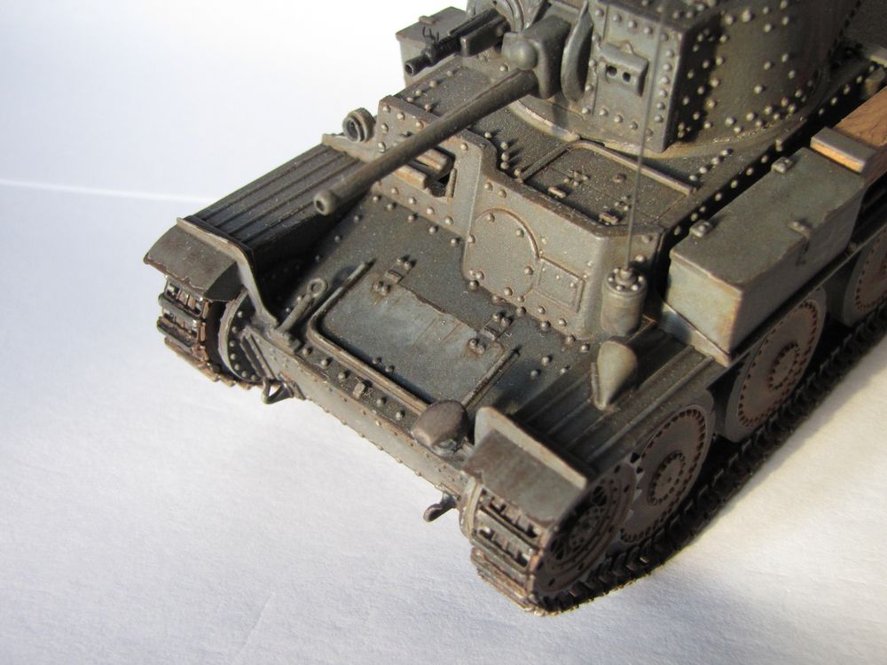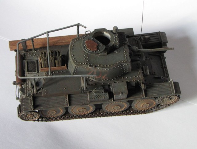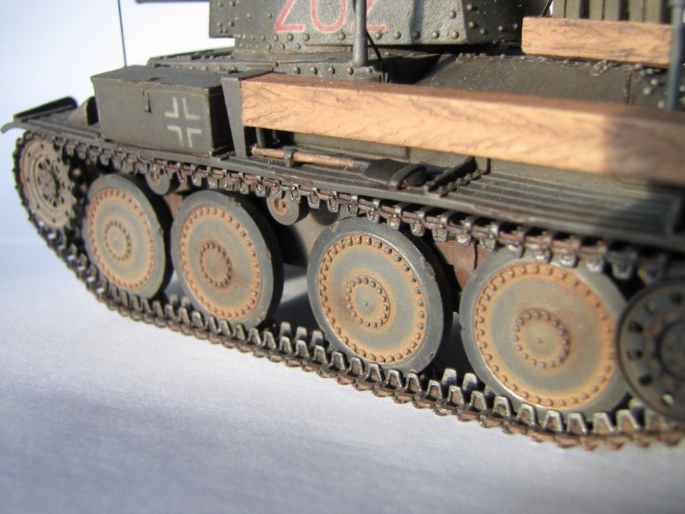 Отличная модель! За матчасть судить не берусь, оценят более знающие коллеги. Из того, что заметил, лично я бы более выделил потертость до металла зубьев ведущего колеса и зашпаклевал шов на своле сверху. Ну и антена, имхо, не очень "пражская".