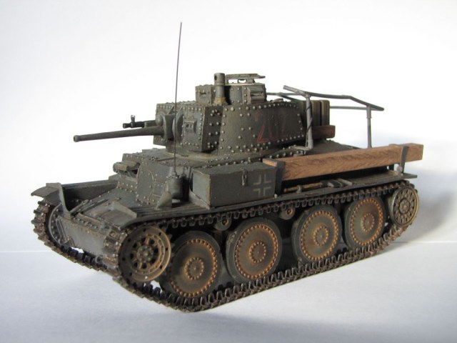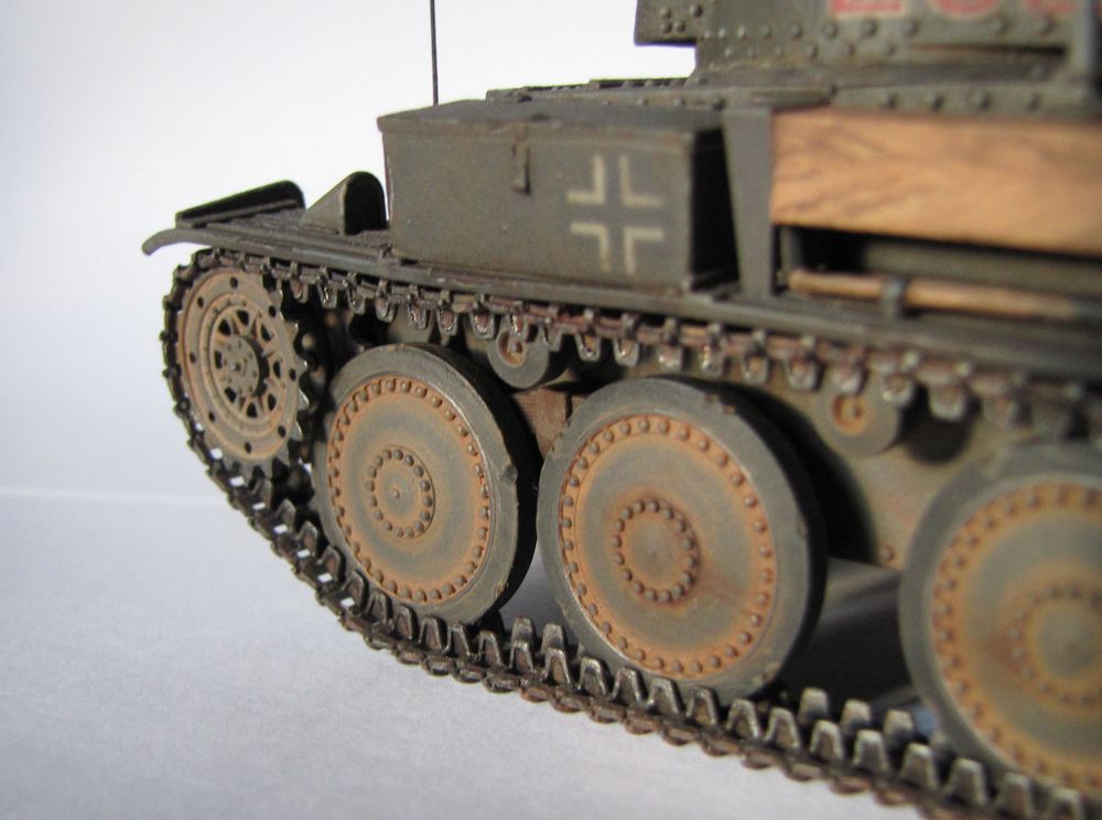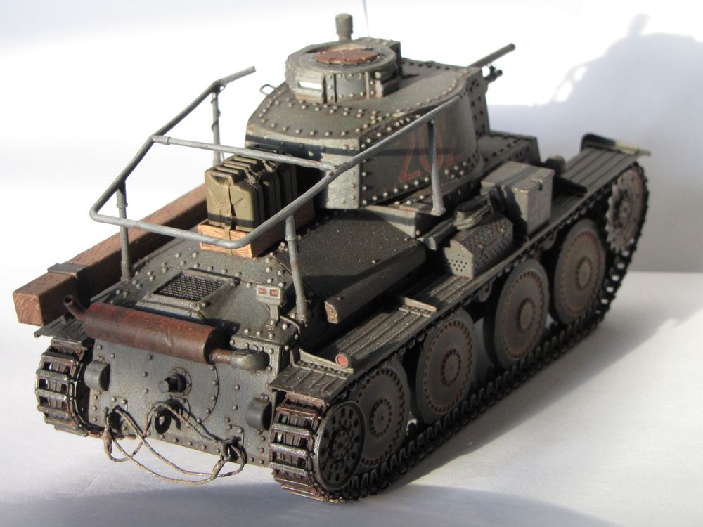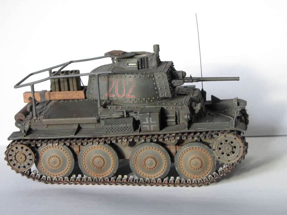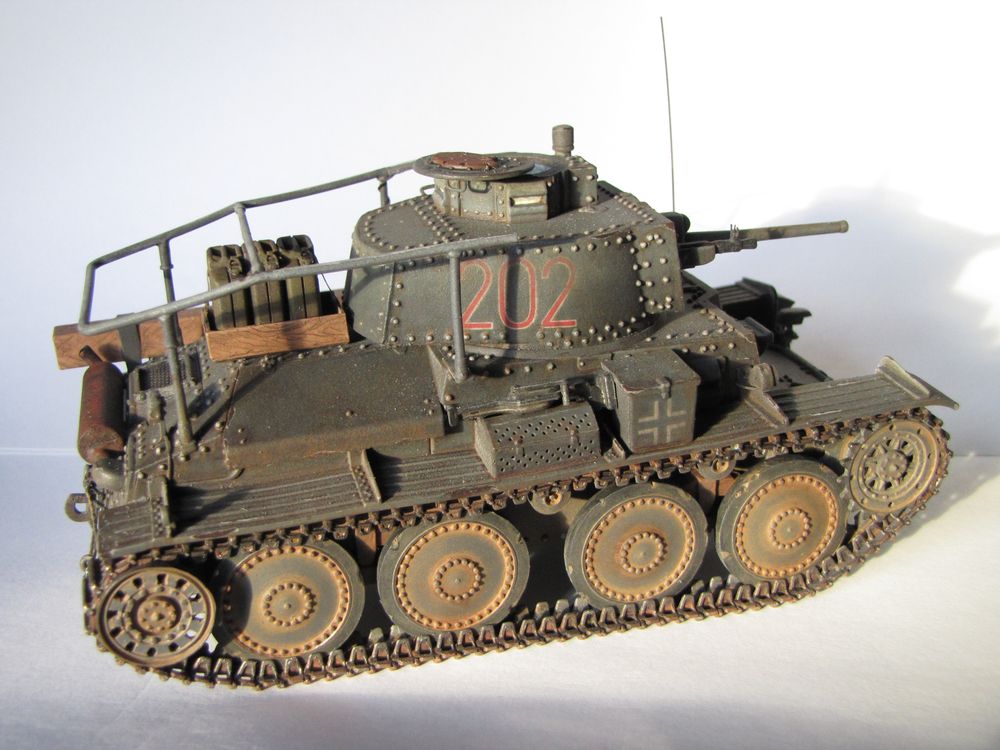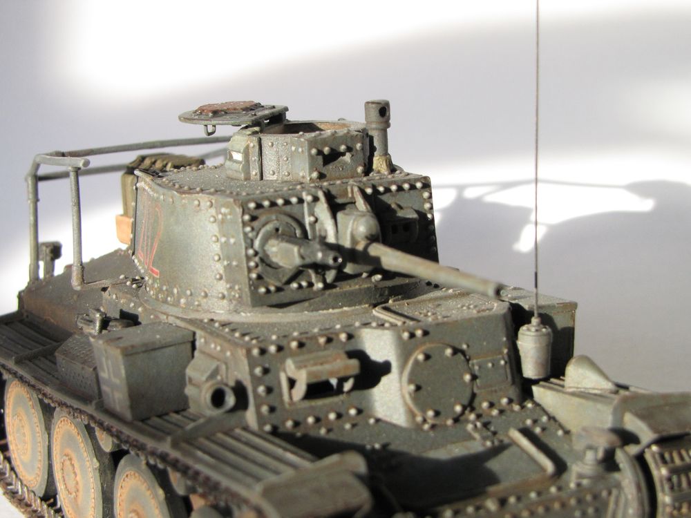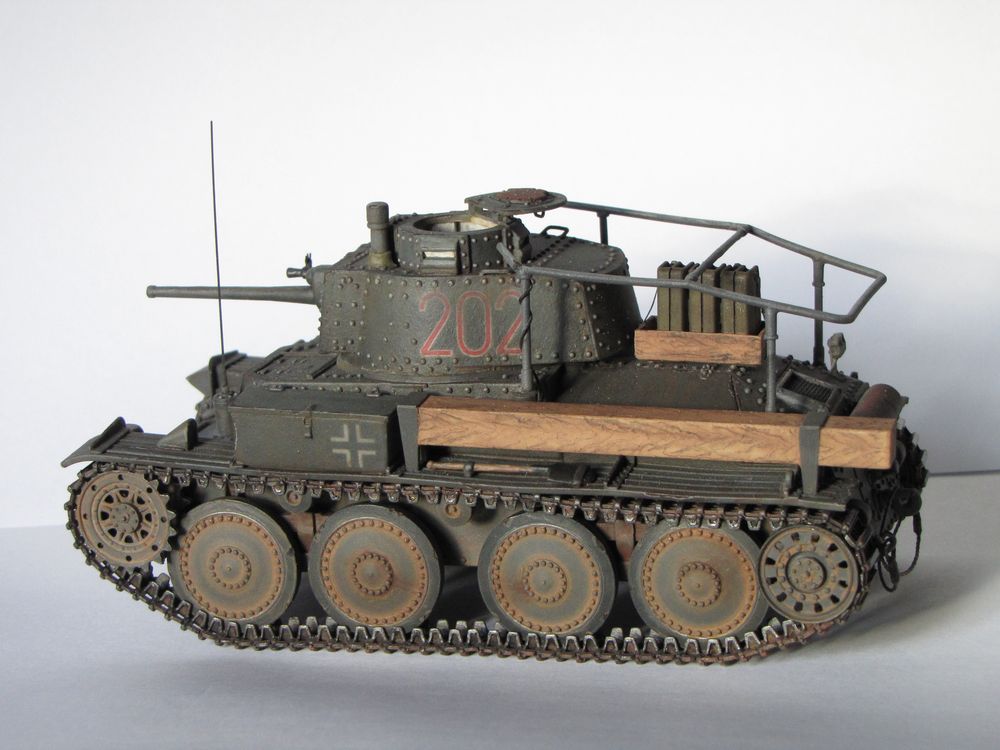 Модель очень и очень достойная! Понравилось все! И исполнение и окраска и матчасть. Единственный минус, на мой взгляд это конечно антенна. Я вот не могу понять, почему в последнее время авторы 38-х считают, что кусочек проволоки (или струны) реалистично передают вид антенны танка? Почему никто не хочет использовать то, что есть в наборе? Обычно антенна от производителя вполне масштабна! Пересмотрите архивные фото. Очень полезно. Антенна была КОНИЧЕСКОЙ формы! А не в форме цилиндра. Если Вам кажется, что пластик толстоват, всегда можно сточить до нужного наждачкой. Или... купить афтермаркет. (благо есть где и что).