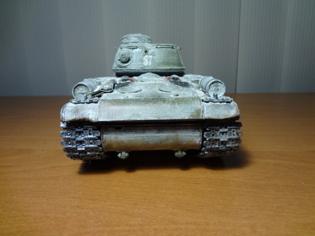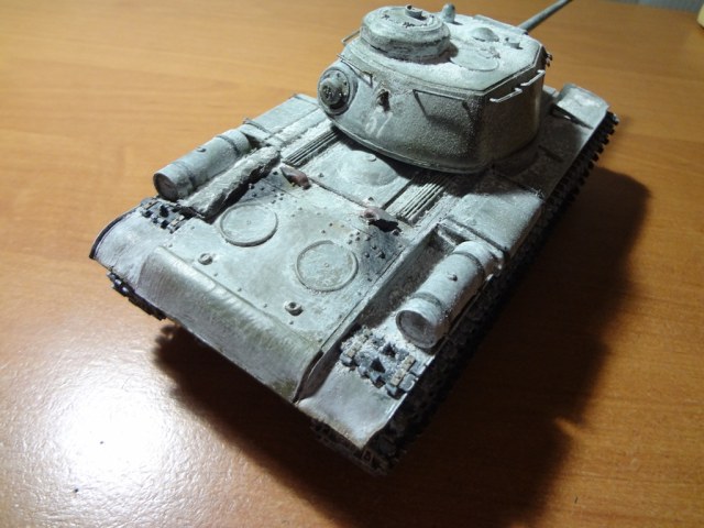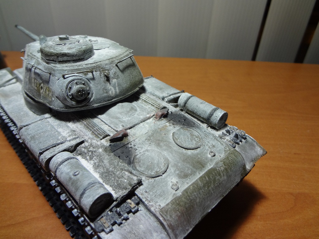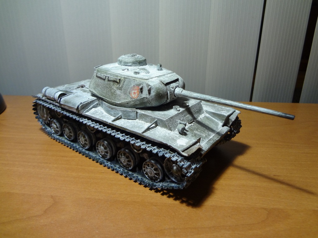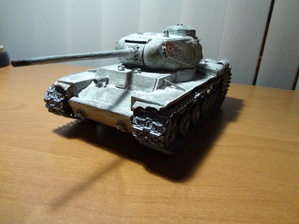 Особой привязки к реальному танку не делаю. Решил сделать в зимней раскраске. Снега много не стал делать, дабы не самая суровая зима. Впервые пользуюсь пигментами (Тамия). Окраска старая добрая кисточка: база-звезда супер (№24) белый-акрил. Из доработок: ящики ЗИП (просьба не придираться к их наличию на данном танке, захотелось так) замена поручней на башне (те меня достали, отпадывали), гусеницы из какого-то набора "Звезды" (вроде КВ)В будущем планируется его получше запачкать, забить траки грязью, и засунуть танк в диорамку. Гусли пока подождут, земля от цветов мне не подходит.