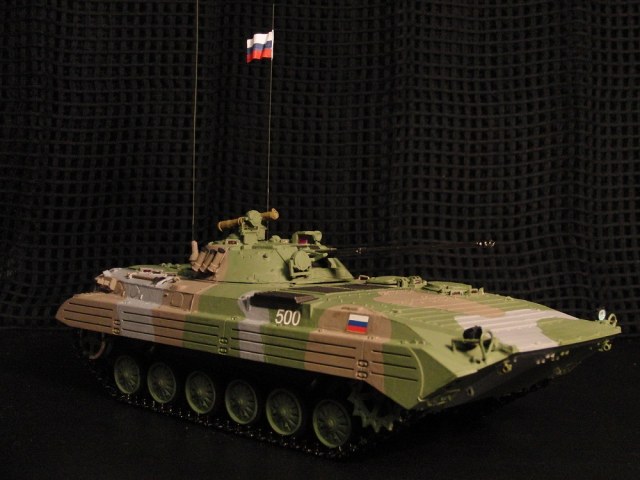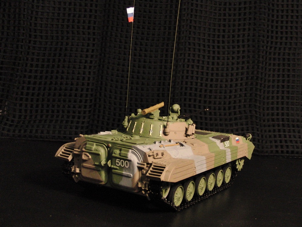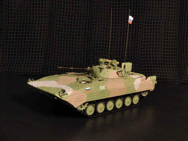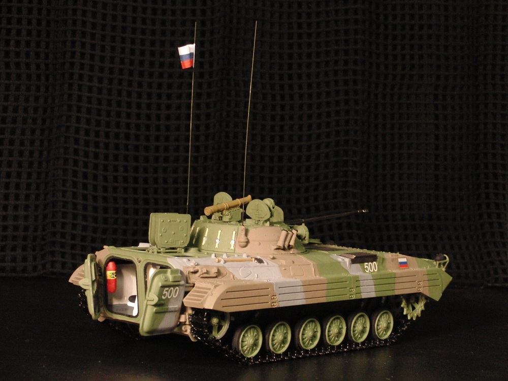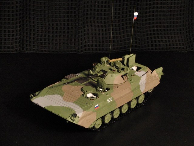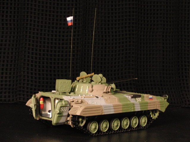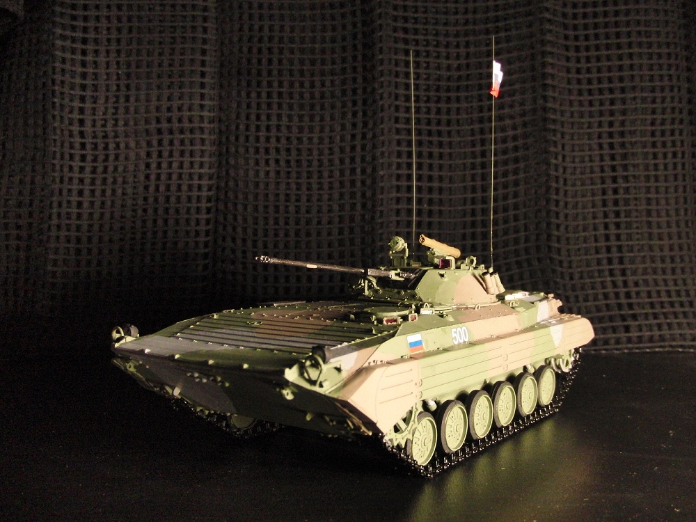 Дорогие моделисты, представляю вашему вниманию модель БМП-2 от фирмы Звезда. Набор был куплен мной довольно давно и вот на конец то был собран. Сборка проходила довольно легко, кое где встречались не стыковки. Удалил правую бойницу так как на реальной машине ее нет! Модель красилась кистью красками фирмы Ревелль. Триплексы сделаны из DVD диска, антенны из гитарной струны. Десантное отделение, а также сидения водителя делал из коробки от CD. Огнетушитель и подушки на сидениях изготовил из модельной пластики. Двери доработал тоже ей. Ствол высверлен! С нетерпением буду ждать ваших комментариев и критике с советами что и как можно сделать лучше в следующий раз. Спасибо за внимание и приятного просмотра!!!