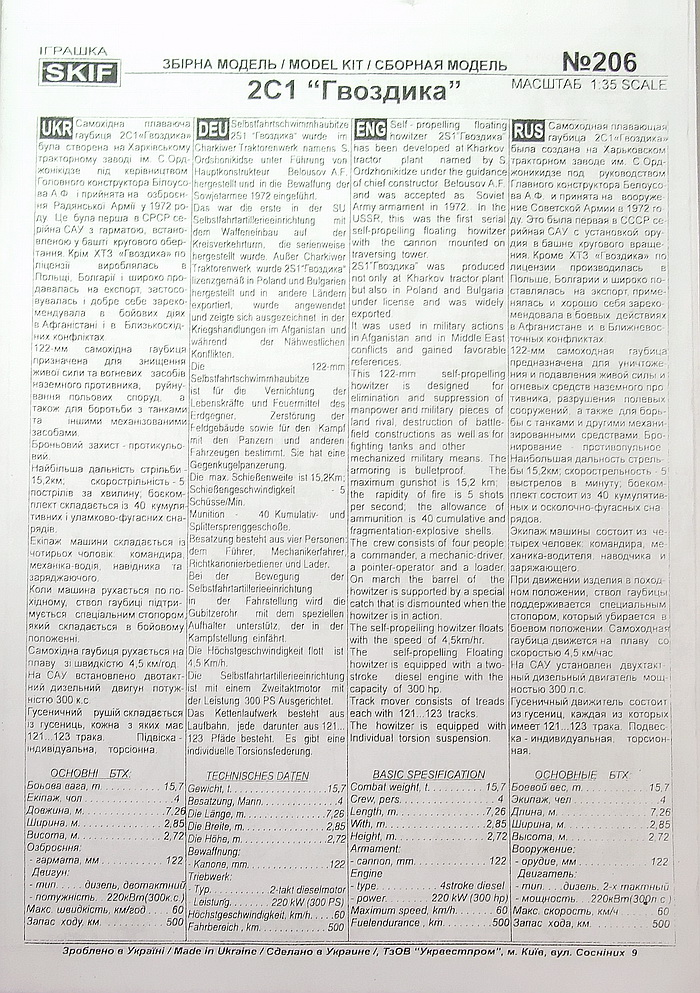 Добрый час уважаемые , каропчане ! Выкладываю на обозрение набор САУ 2С1 Гвоздика от производителя - Скиф . Набор состоит из 4 литых секций , виниловых гусениц , декали , плата травления и вполне внятная инструкция . Пластик довольно хорошего качества , мягкий , хорошо режется и скоблится . Облоя практически нет , без утяжин , смещения и следов толкателей в ненужных местах . Теперь о неприятном - на модели нет ни одной иммитации сварных швов , хотя в оригинале их предостаточно , вместо этого частично даны просто небольшие полоски . Отсутствует какой либо прозрачный пластик для стекла . Толщина некоторых элементов явно не в размер , как например навесные элементы для плавания . Волнорез выполнен за одно с носом . Наружные соединения корпуса придется прятать под шпатлевку . Ну вроде и все , что хотел сказать основное , выписывал через интернет , сама модель обошлась в 620 руб. Думаю для любителей попилить - работы хватит , а для изкоробки - вполне нормально ! От себя скажу - сколько пересмотрел фото , самые интересные Гвоздички нашел в современном польском варианте и морпеховские .