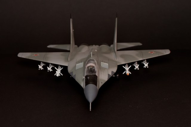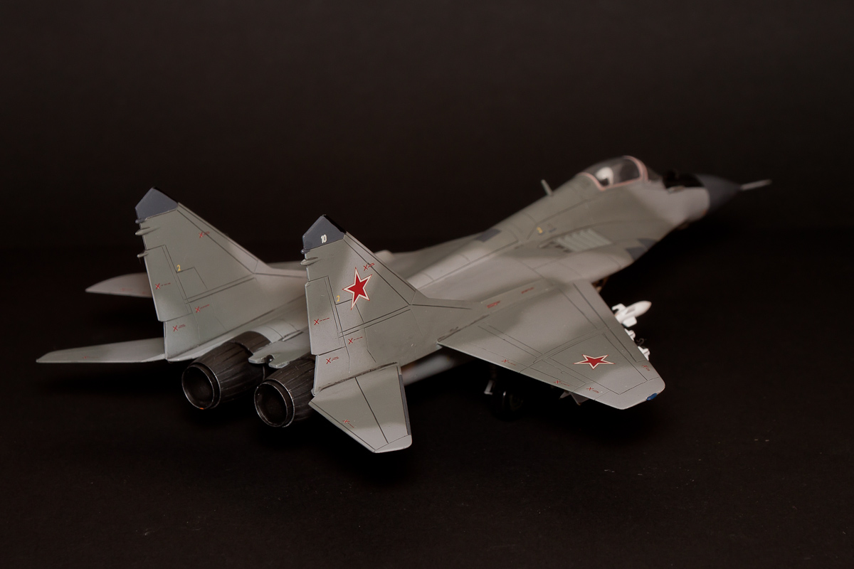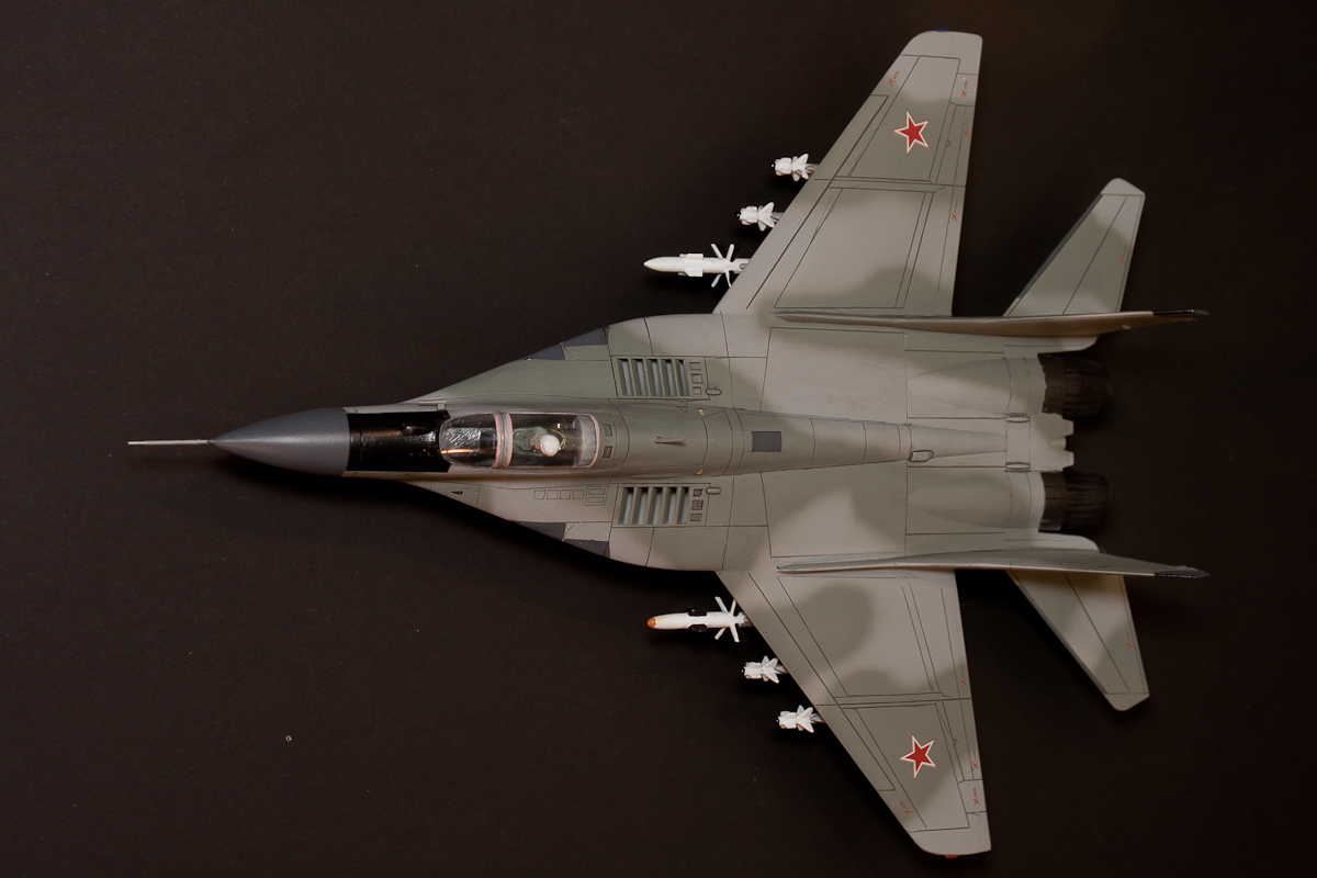 Вполне зачётно! Первое, что бросилось в глаза - это несоответствие окраски оружия на внутренних пилонах (Р-27). И конечно нужно было поработать над ракетами. Например, Р-60 на себя не похожи. И когда стабилизаторы у них (ракет) тоньше более реалистичнее смотрятся. ПВД ни такого профиля и слишком толстый. Про остальное сказали. Успехов в дальнейшем!