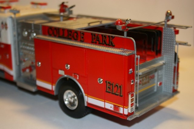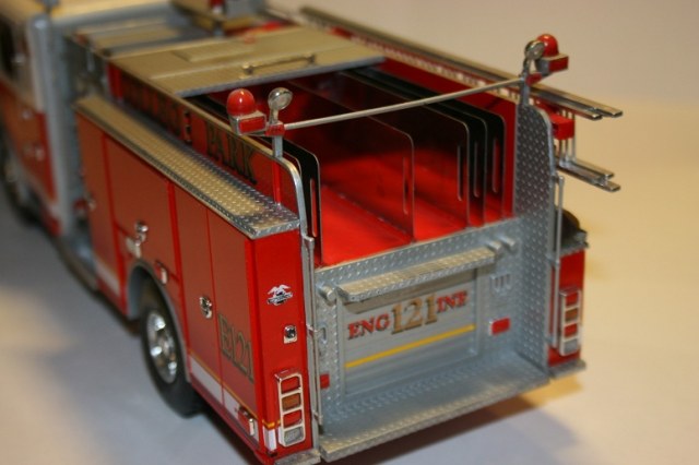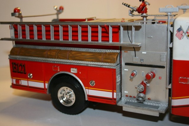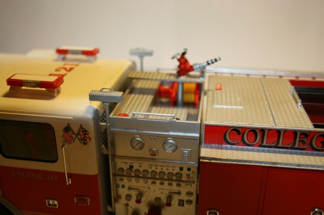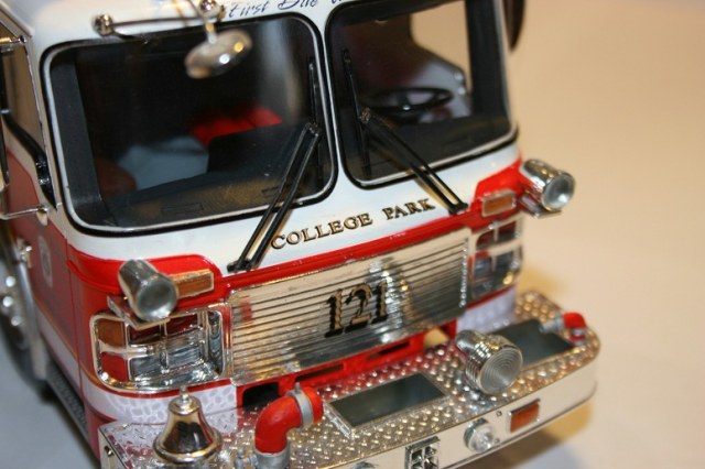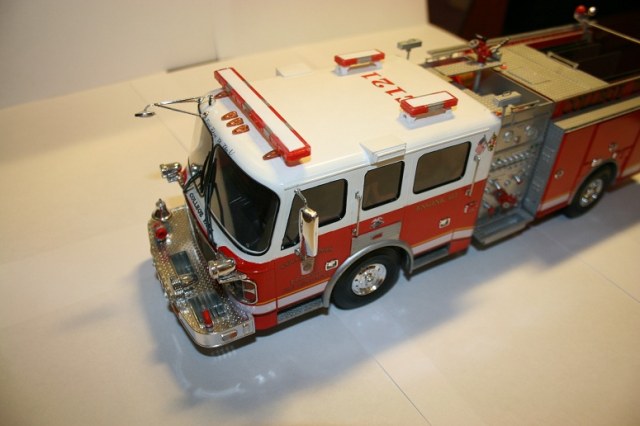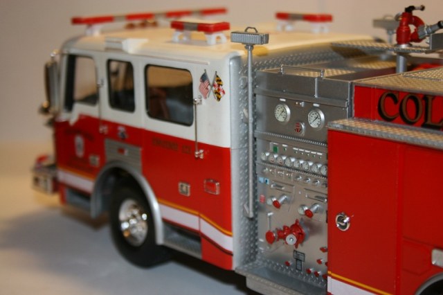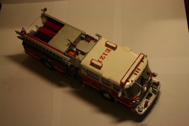 Эту модель в коллекцию я захотел сразу как только увидел ее в журнале М Хобби номер к сожалению не помню, иметь пожарную машину пожарного деппо как бывшего МЧС-са для меня было делом чести. И вот она у меня, отлита она из белога пластика имелись утяжины, следы толкателей и мои любымые облои так ка видно отливалась она по старым технологиям. Клеил и красил я машину частями частями - первая часть это была кабина с небольшим интерьером (копался в нете фото кабины я так и не нашел) хотел добавить кислородные балоны но потом присмотревшись к креслам понял что пожарные на западе все свое носят с собой о чем говорили формы кресл. вторая часть это насос с лафетом, много руда в склейки он не потребовал как и в окраске ювилирной работы затребовали датчики давления подачи воды выполнены они при помощи декалий из набора а имитация стекла при помощи эпоксидного клея секунда.