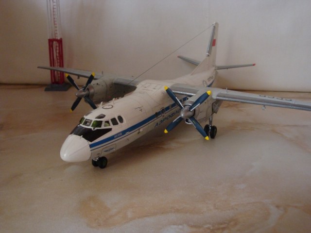 Добрый вечер. Представляю Вам Ан-24б. Модель была собрана в 2009 году. Еще до выхода модели был собран салон, куда вошли: пол, потолок, передний и задний багажный отсек, переборки салона, туалет, кухонный блок. Установлены кресла. В процесе сборки доработаны входные двери и добавлены антенны.