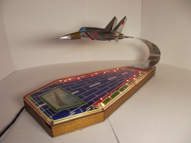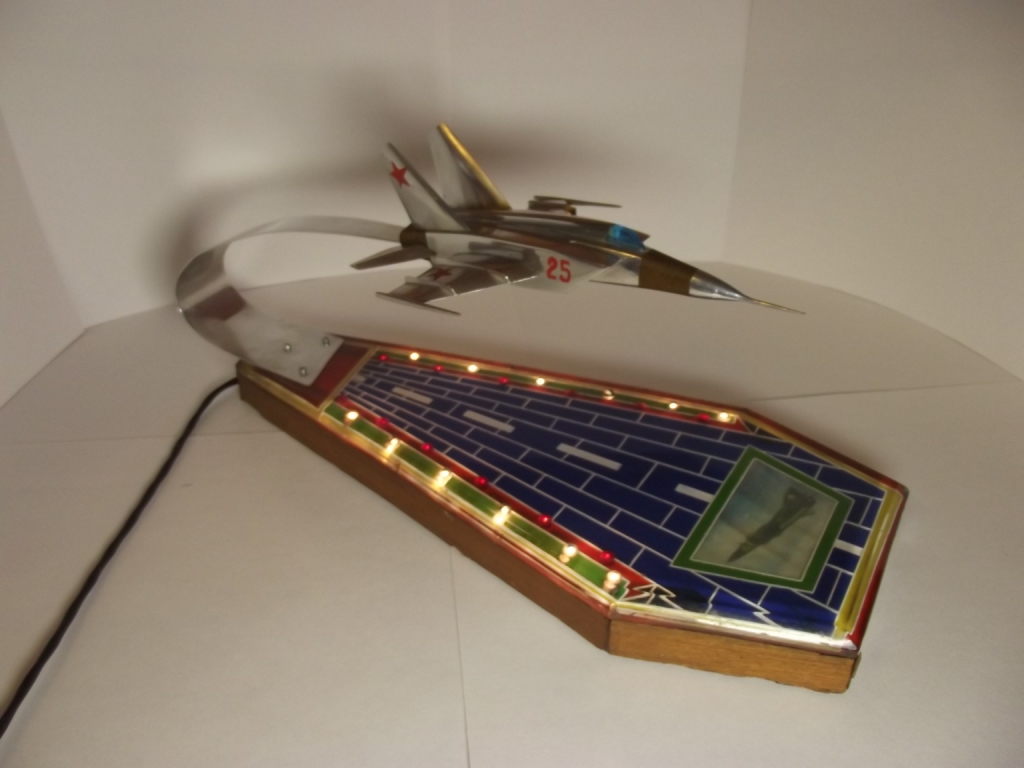 Огни взлетно посадочной полосы мерцают красно-зелеными цветами. К сожалению фотографии этого не передают. Сама ВПП из оргстекла. Самолет из авиационного алюминия, т.к. служба проходила в Комсомольске-на-Амуре, я думаю там этого добра предостаточно:)