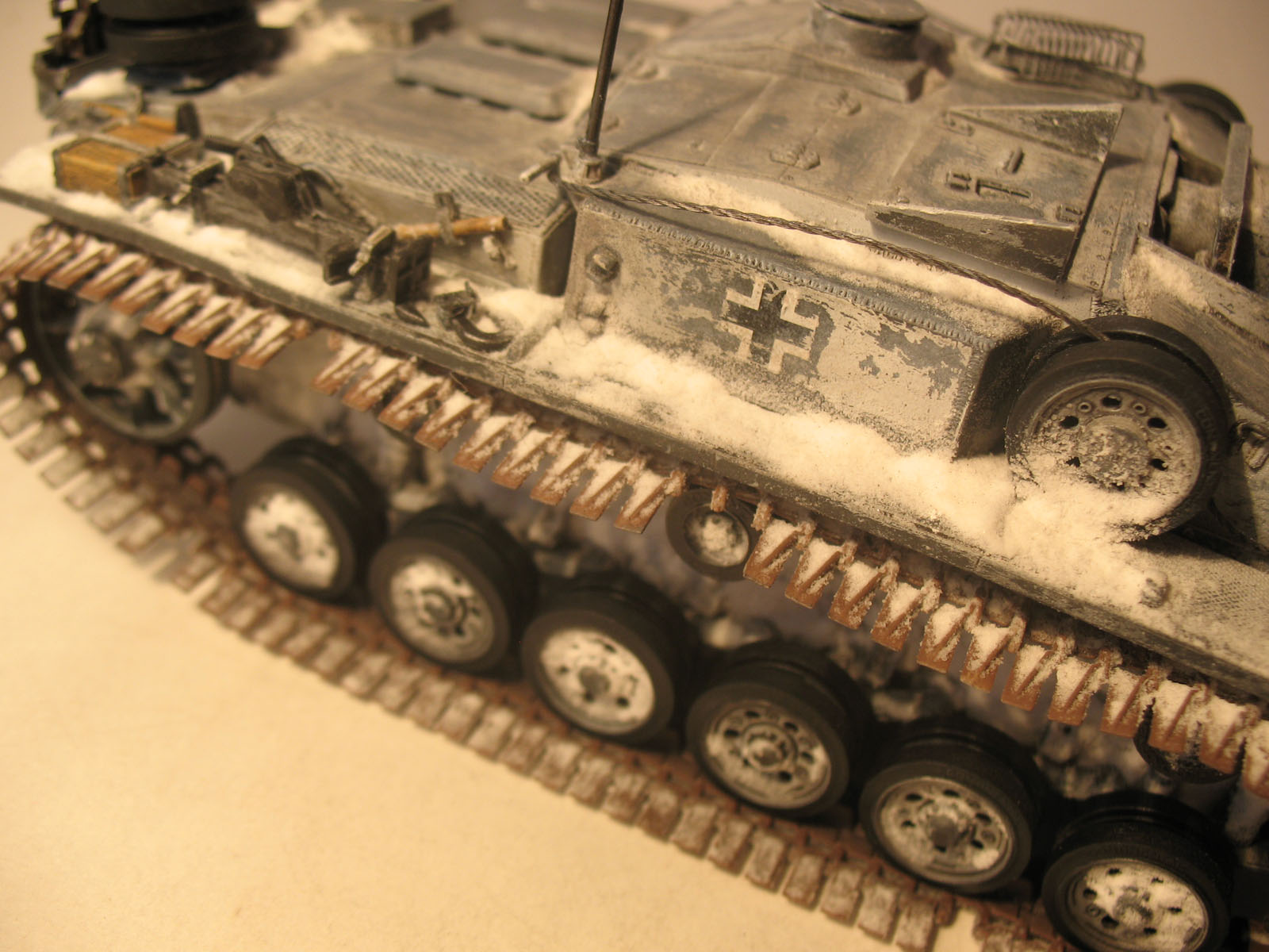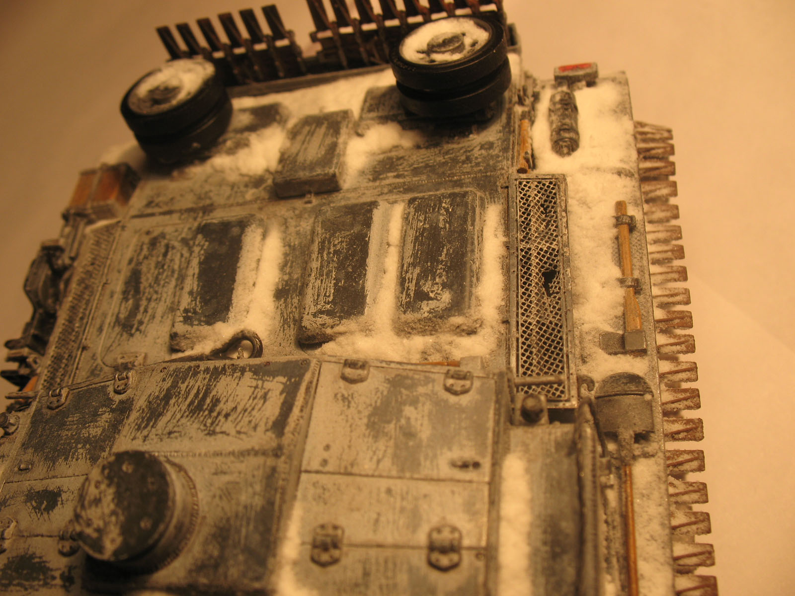 Здравствуйте, уважаемые коллеги! Очередная модель готова к размещению и обсуждению. Новая модель-новый эксперимент. В этот раз мною была опробована технология нанесения "снега" при помощи лака для волос и соды. Особых проблем сама технология не вызвала, но судить конечно вам. Сразу же хочу извиниться за фон и освещение, никак не смог подобрать нужный баланс. Теперь по модели: Драконовский набор вновь порадовал, проблем не возникло, модель собиралась полностью из коробки, разве что добавил запасные катки на рубку. Красил как обычно Тамией акрилом, пигменты и смывка MIG. Оценивайте, советуйте, стерплю любую критику.