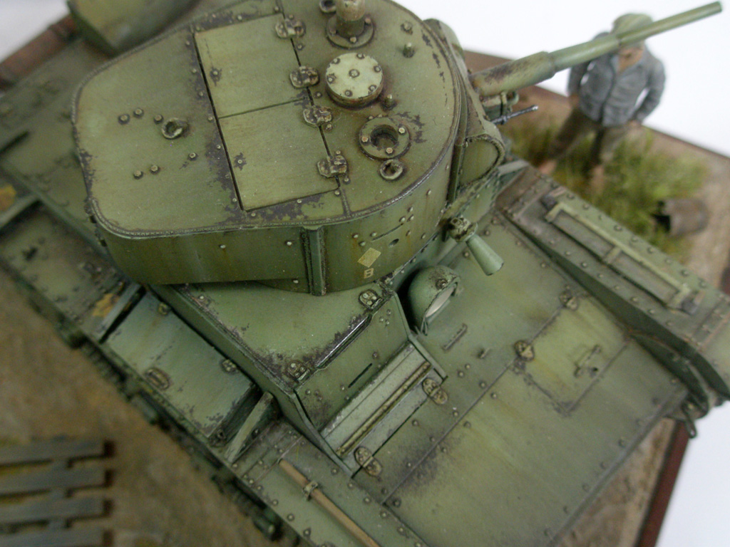 Модель от Звезды в сборке показала себя относительно неплохо, только имитация брони на верхнем листе башни уж очень рельефна, пришлось убирать. Из доработок- немного добавлена клепка, заменена решетка, крепления инструмента, глушителя, добавлены сварные швы и т.д.