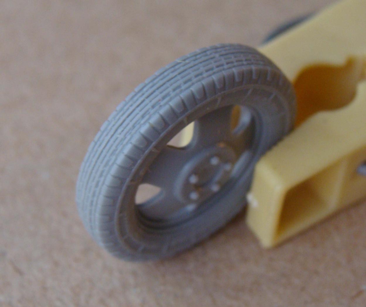 После окончательной сборки оказалось что пакет резины несколько толще чем диск и похож больше на резину для ЗИСа. Для примера сфоткал колесо от ТОКО нынче Звезда. Сам протектор не четкий. С обратной стороны диска умышленно приклеил пакет со смещением, дабы показать возможную щель.