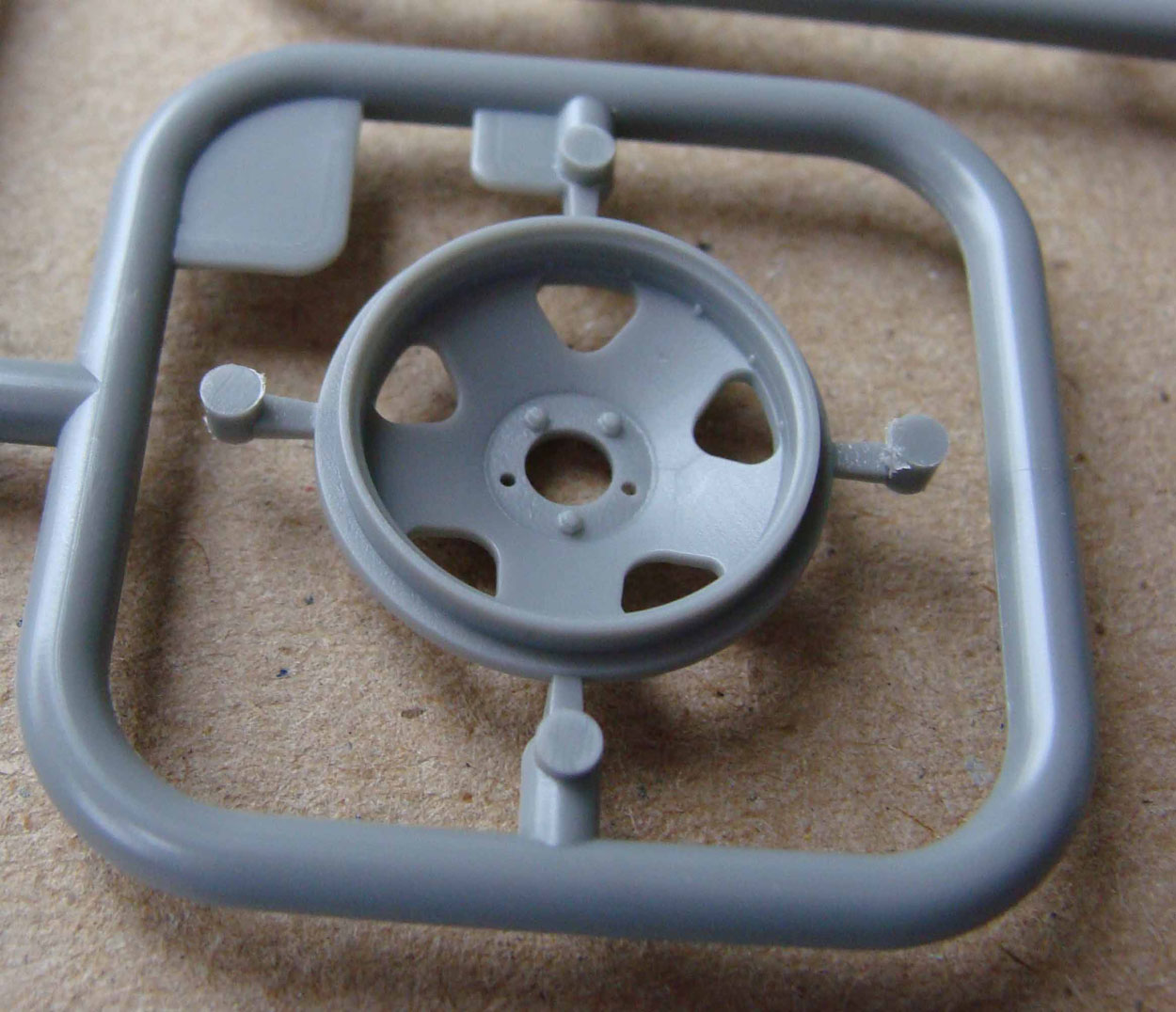 Набор упакован в коробку из хорошего картона с отличной полиграфией. Внутри лежит инструкция ( 1 лист с двусторонней печатью) и целлофановый пакет с 6 литниками. Один литник рассчитан на сборку двух колес в разных вариантах. Можно собрать или два передних колеса (они же внутренние задние) или по одному: заднее наружное, запаска с отверстиями, запаска с крепежными болтами. В наличии ступицы и тормозной барабан.