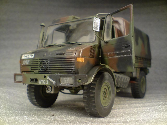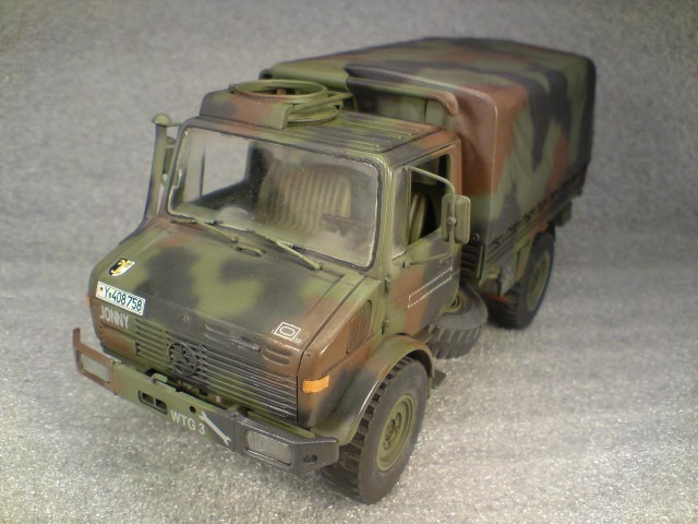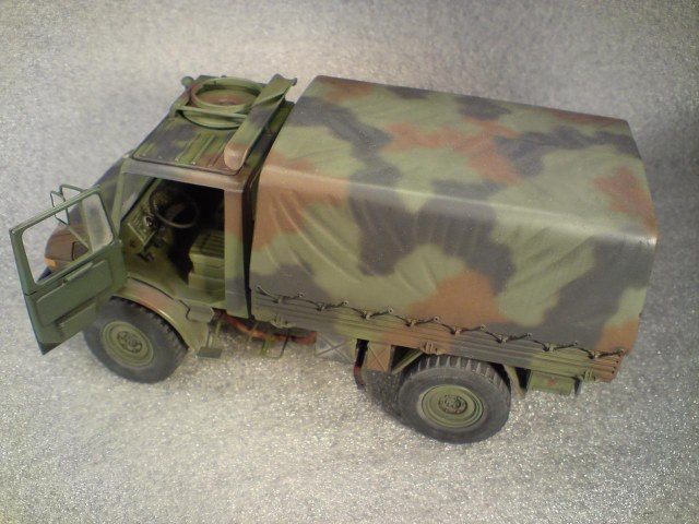*Доброго времени суток!Хочу представить на Ваш суд ещё одну свою модель-собрана она была лет двенадцать тому назад/просьба учесть это смягчающее обстоятельство при вынесении приговора/.Прототип в особом представлении не нуждается-MercedesUnimog,машина знаменитая во всём мире/и как “цивильный”,и как надёжный “солдат”/.Пластик -типично ревеловский/со всеми минусами/,сборка особых затруднений не вызвала/насколько я помню…/-красил ,как обычно,нитроэмалью;лёгкое “запыление”-тоже нитроэмаль( те времена ещё не было нынешнего “разгуляя” модельной химии…)Основным “напрягом”при окраске мерса для меня был “фирменный”бундесверовский камуфляж/подбор цветов,нанесение пятен./-но в тот раз вроде угадал…*****