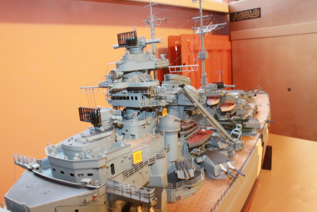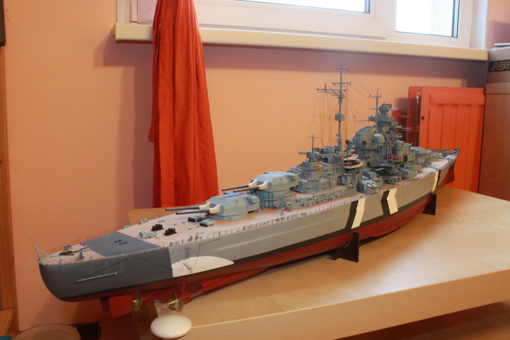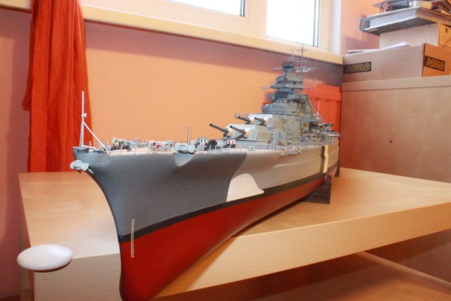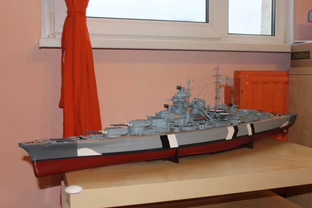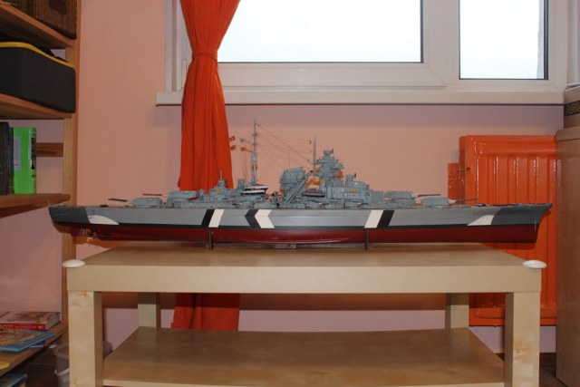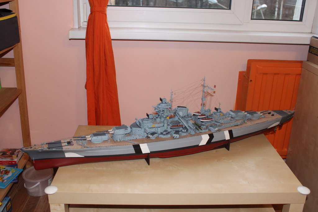 Отлично сделано ! Тоже хочу такую красоту собрать,именно в таком масштабе- 1/350 Не скажете какая высота Вашего "Бисмарка" от поверхности на которой он стоит, до верхней точки мачты .Не хотелось бы переделывать мои полки для моделей .