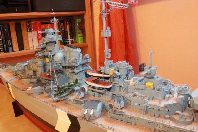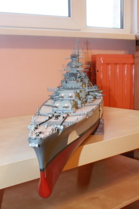 Собирал "тупо из коробки", точнее, из журналов. Отмечу, что корабли, да еще 20 века - мягко говоря, не мой профиль. Парусник еще ладно, но линкор... А когда начинал, и вовсе с моделизмом был знаком шапочно. Сейчас я сам являюсь поборником соблюдения матчасти, но здесь, должен признаться, пороху не хватило. Уж больно огромен объем работ - чтобы такой "Бисмарк" собрать действительно "по науке", надо иметь, думаю, немалый опыт да еще заниматься на протяжении 3-4 лет исключительно им, не отвлекаясь на другие проекты. А на это я пойтить не мог )) В чем я убедился, так это в том, что построить корабль куда сложнее, чем самолет или танк, ведь надо знать в разы больше матчасти, фактически надо изучить каждый узел в отдельности, каждый дальномер или орудие. Да еще и покраска отдельная песня, ровно "закрыть" такие большие площади надо. Перефразируя известную песню, "...как собирают пароходы - совсем не так, как самолеты" )) Даже красить "балтийский камуфляж", с полосами на надстройках не стал, так как побоялся испортить.