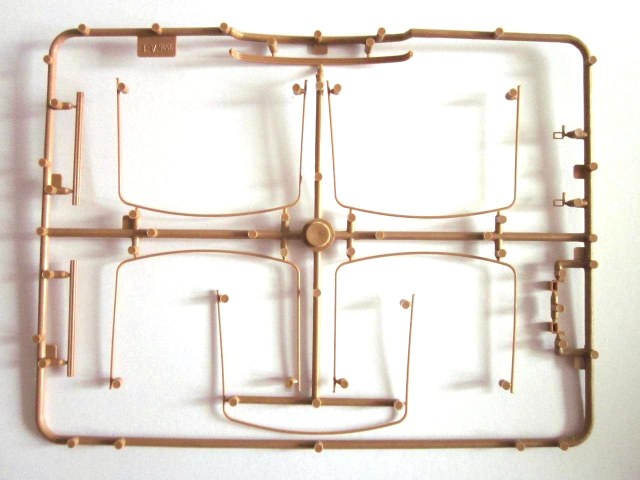 И наконец, литники. Их 7 штук, 6 - песочного цвета один - прозрачный с довольно тонкими и масштабными стёклами. Также в наборе присутствуют 2 фигурки водителя: весело смеющимся, высунувшегося из окна и копающегося в двигателе. Из косяков самым главным можно выделить слишком толстый значок на капоте. Понравилась фактура древесины на кузове. Можно сделать с зарытыми и открытыми дверьми, сделать видным двигатель. Каркас под тент можно сделать как в стандартном положении, так и в собранном спереди. Лавки в кузове ставятся поперёк, можно совсем не ставить. Фары можно поставить из прозрачного пластика, или же надеть колпаки с прорезями, которые также есть в наборе.