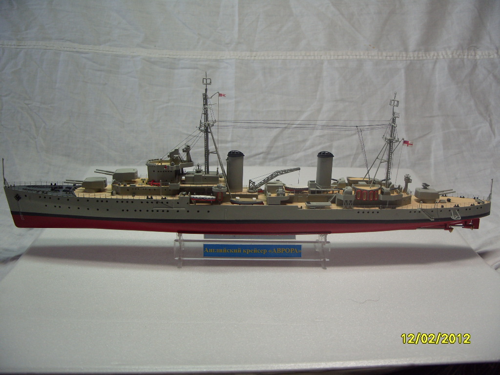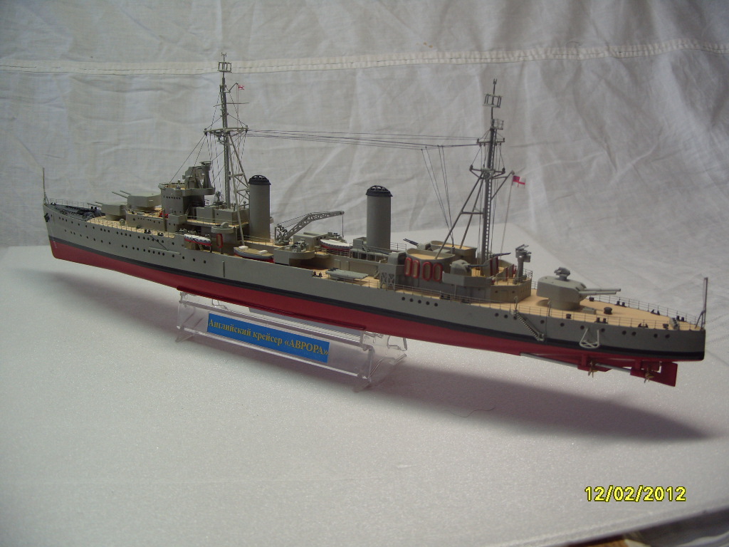 Набор был подарен после областных соревнований по радиоуправляемым моделям в июле 2010 года. Масштаб модели 1:300. Модель ориентирована на прототип в феврале 1948 года. В качестве дополнительных источников использовались старые чертежи на систершип "Пенелопа", предоставленные Степановым Вячеславом Александровичем из Невиномысска, фотографии "Авроры", книга Морская коллекция. 2002.06. Крейсера типа "Аретьюза", которые скачал мне из Интернета брат. Собирать начал в ноябре 2010 года, закончил в середине декабря 2011 года. Окраска низа корпуса алкидная аэрозольная эмаль "Touch'N Tone". Все остальное красилось кистью красками "Супер" от "Звезды".