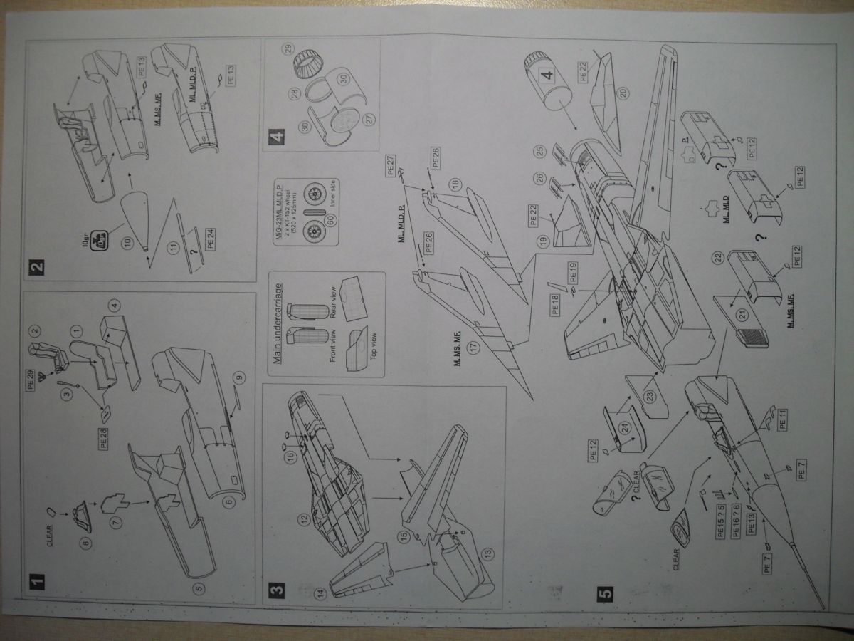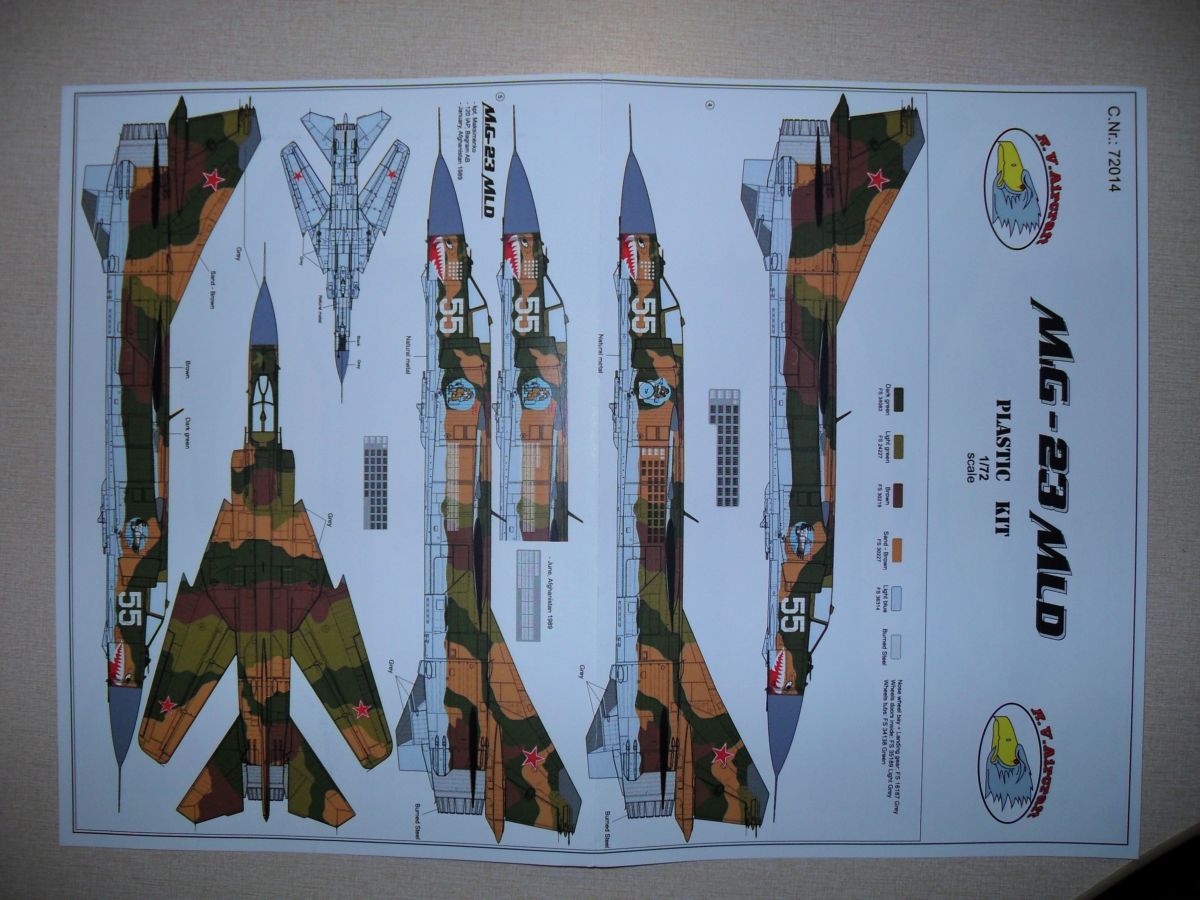 Наконец мне в руки попал МИГ-23МЛД от R.V.Начнем по порядку,коробка из твердого картона,что гарантирует сохранность отливок.На лицевой стороне изображен самолет на взлете,на боковиках варианты маркировки и окраски.Литники хорошего качества,облоя и утяжин не наблюдается.Крой тонкий и качественный.Фонарь кабины не толстостенный, прозрачный.Имеется плата фототравления с антеннами стекателями и цилиндрами открытия створок шассию.Инструкция на трех листах А-4 и цветной схемой окраски пяти вариантов.Декаль хорошего качества из двух листов с подробной техничкой,номера на четыре варианта(55 борт два варианта окраски и маркировки).Сравнение с чертежами из книги С.Бурдина "МИГ-23 ИСТРЕБИТЕЛЬ"в основном ложится нормально в контуры,отклонения менее 0,5мм можно списать на полиграфию.Расшивка в основном совпадает с чертежом.Фары на ВЗ изображены контуром и требуют доработки.В целом впечетление от модели хорошее,посмотрим как будет проходить сборка.Не знаю куда отнести отсутствие вооружения к минусу или к плюсу.