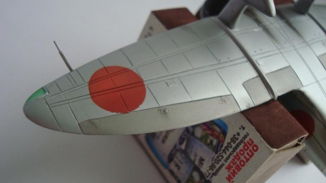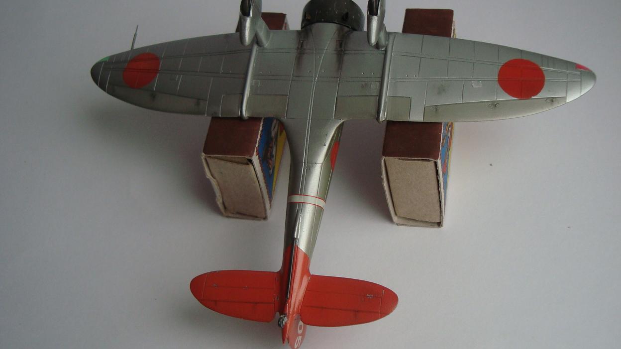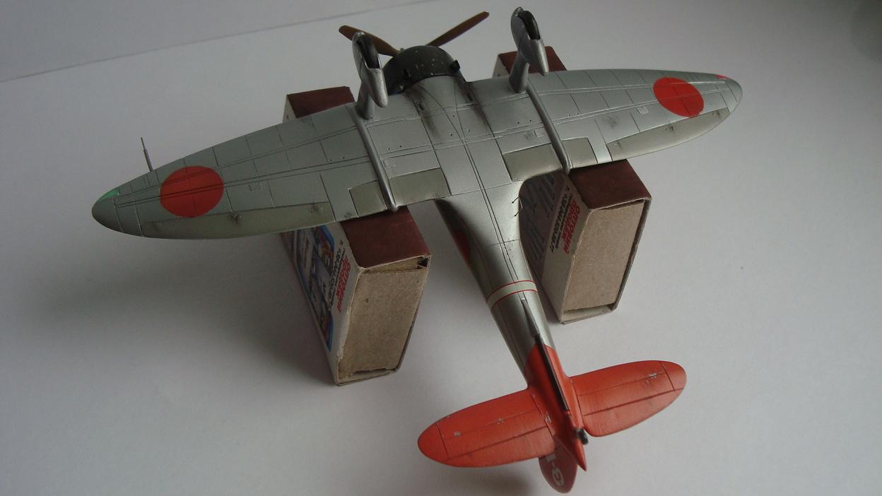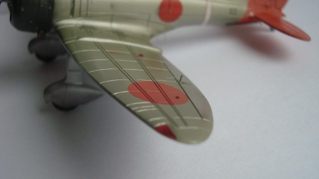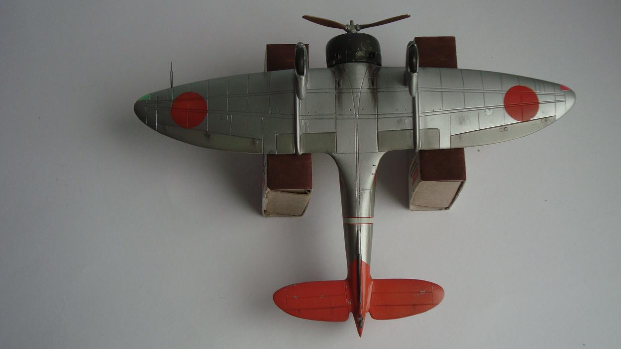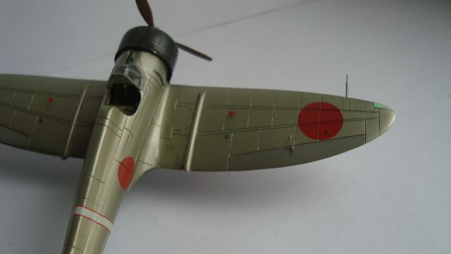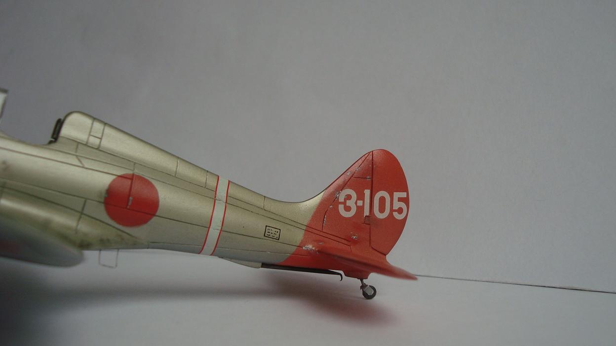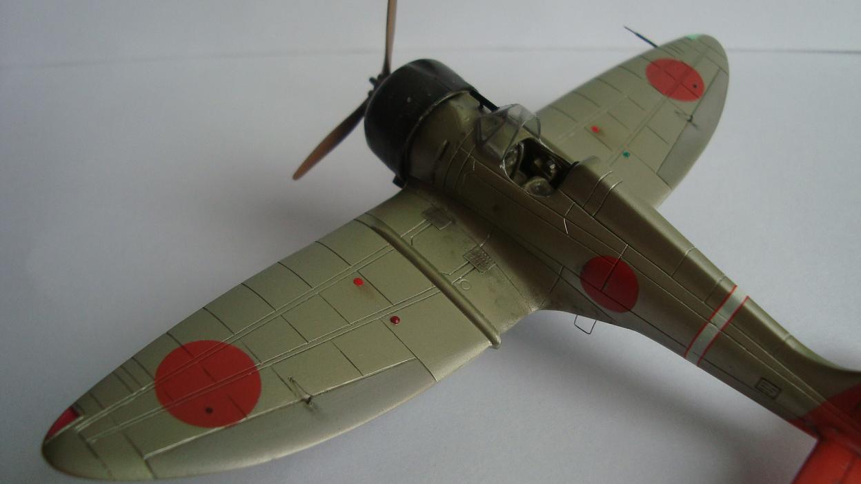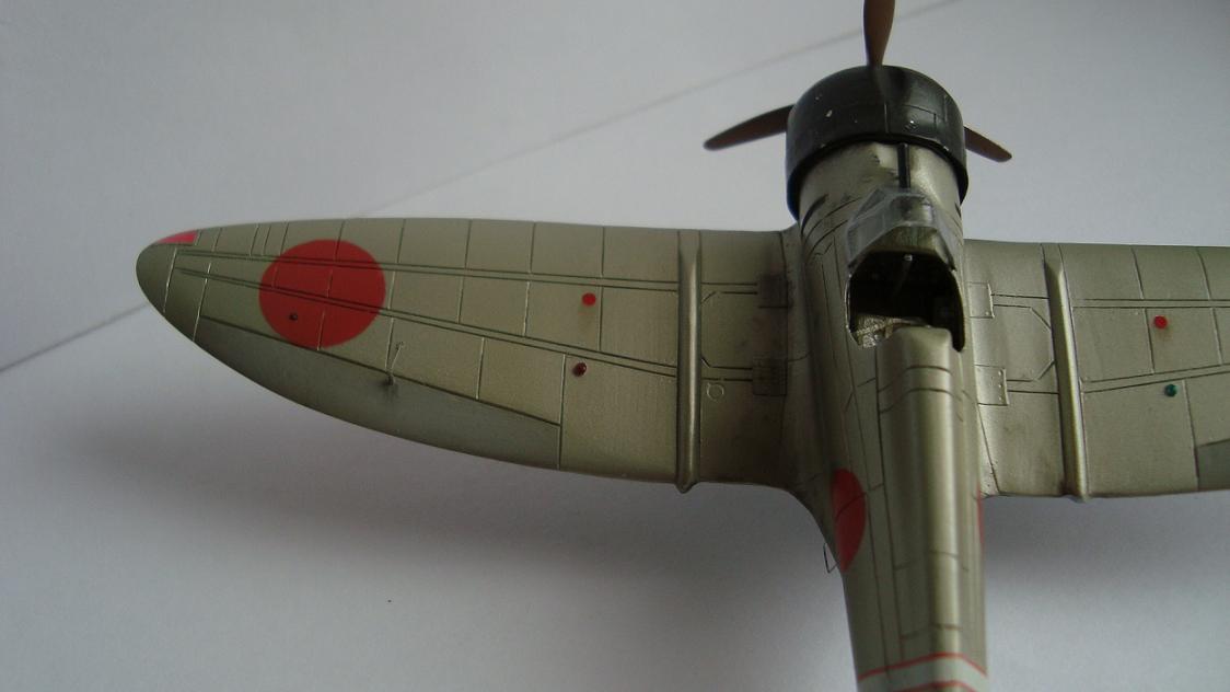Красил таким макаром: после грунтовки задул серебром всю модель, верхние поверхности прошелся разбавленным металликом с капелькой желтого цвета (самолет был покрыт бесцветным лаком, при его выгорании на солнце приобретал желтовато-золотистый оттенок). Далее снова укрыл обычным металликом тонким слоем. Так как на заводе, скорее всего, рисовали только хиномару, а в части наносили коды и покрывали лаком, красный цвет сверху задул тонко этим же желтоватым металликом. Нанес повреждения ЛКП иглой. Ну и задул свежим красным цветом хиномару, по легенде, подкрашенные недавно, но немного "полетавшие" (немного прошелся иглой по границам кругов). Подвижные элементы окрасил металликом с капелькой серого. Красил Мр. Колор, нитрой. Деки - цифры на киле от фуджима.