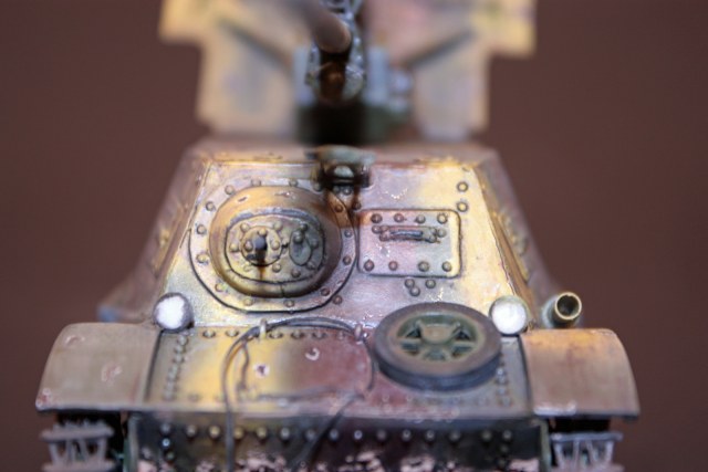 Почему так долго? Поверьте, наборчик вас займет надолго. Например, тележки ходовой. Там все разрезано, переточено, собрано обратно и добавлено отсутствовавшее. Итога месяца три. Еще пример. Траки Modelkastenотменные, но они не «на щелчек». Поскольку ходовая этого набора один застарелый, кровоточащий геморрой, было принято решение делать гнущуюся ленту с помощью заклепок 0,5 мм (большие не влазют). Итого, полтора месяца. И все так и только так. Психовал и бросал «все к ебеням!» раза три. Точно не помню. Были еще локальные нервяки.