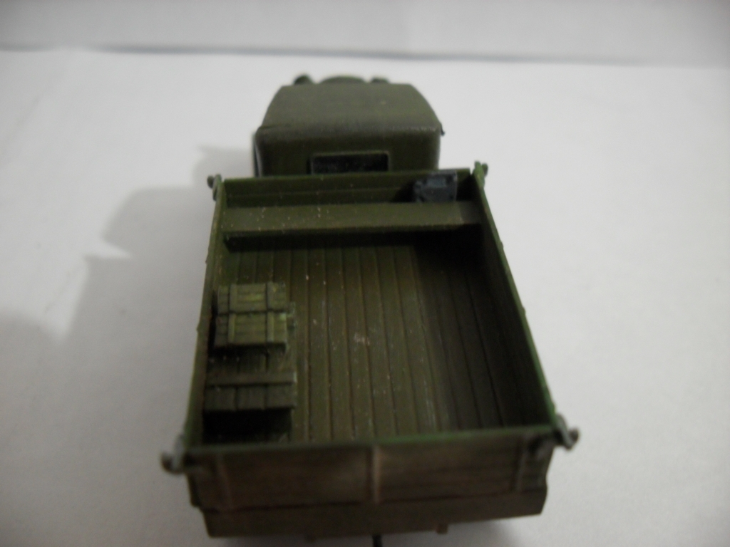Сборка искоробочная. В кузов поставил только одну из четырех, предлагаемых производителем скамеек и кинул пару ящичков из своих запасов. Тент в наборе был очень уж страшный, его не ставил. Неровно состыковал крышу кабины с задней стенкой. При обработке, уступ вроде, полностью сточил, но при покраске он опять вылез. Высверлил фары, выкрасил изнутри серебрянкой и закрыл прозрачным пластиком от таблеток. "Стекла" фар переделывал трижды, ровнее на получилось. Кабину красил кистью, раму и кузов - аэром. По ребрам прошемся мягким карандашом.Чуть припылил пастелью.